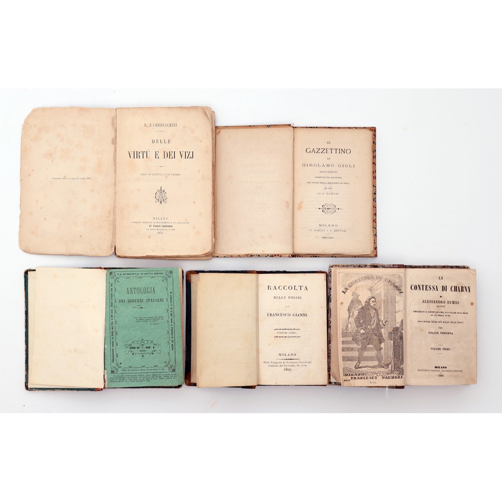 CINQUE VOLUMI DI VARIA LETTERARI DEL XIX SECOLO: 1) R. Lambruschini DELLE VIRTU’ E DEI VIZJ, ed. Paolo Carrara, Milano 1873. Con dedica ad Eugenio Viesseux. In 8° piccolo. Brossura editoriale figurata, tagli in barbe, fogli ancora freschi. Collana Biblioteca Ricreativa. Qualche piccola usura ai margini. Raffaello Lambruschini fu uno dei cofondatori, insieme a Gino Capponi, Cosimo Ridolfi e Lapo de’ Ricci, dell’Accademia dei Georgofili di Firenze. Pp. 284 (4).2) Alessandro Dumas LA CONTESSA DI CHARNY, nuova versione italiana sulle migliori edizioni francesi per Felice Venosta, ed. Milano, Francesco Pagnoni 1868. Sei volumi in unico tomo. Sei xilografie f. t. all’antiporta dei volumi. In 16°. Legatura coeva in mezza pelle con piatti marmorizzati. Leggere bruniture del tempo. Pp. 152; 155; 158; 155; 155; 156. 3) RACCOLTA DELLE POESIE DI FRANCESCO GIANNI, ed. Giovanni Silvestri, Milano 1807 – 1808. 1^ edizione. Legatura coeva in mezza pelle con piatti cartonati e titoli in oro al dorso. In 16°. Leggere fioriture sparse ma le carte sono in perfette condizioni e ancora fresche. Francesco Gianni è stato un poeta improvvisatore italiano talmente famoso che Napoleone lo assunse come poeta improvvisatore di corte. Pp. 132; 120; 108; 144; 108. 6) Collana La Strenna D’Ogni Mese ANTOLOGIA DEI GIOVANI ITALIANI, ed. Ufficio del Periodico, Roma 1879. In 16°. Legatura successiva che contiene le brossure originali; in mezza pelle con piatti cartonati e titoli e fregi in oro al dorso. In 16°. Carte ancora fresche. Circa 300 pagine. 7) IL GAZZETTINO DI GIROLAMO GIGLI, Nuova Edizione Corretta col riscontro del Codice della Biblioteca di Siena per cura di L. Bianchi, Milano G. Daelli e C. Editore MDCCCLXIV. In 16°. Legatura in cartonato decorato e titoli in oro entro tassello al dorso. Tagli irregolari. Accademico della Crusca ne fu espulso nel 1717 per la polemica sulla prevalenza del senese sul fiorentino. Le sue opere fecero scalpore per i tempi. Pp. XL, 177.