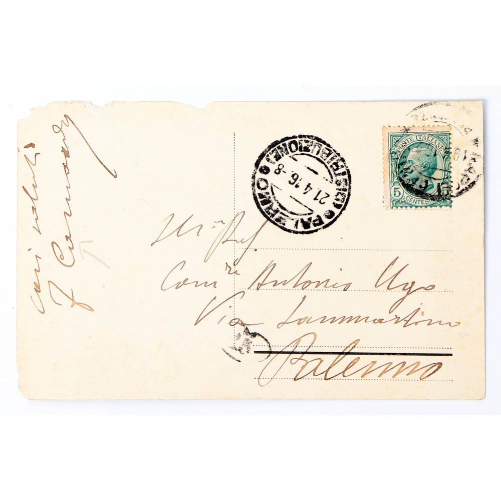 CARTOLINA AUTOGRAFA DEL PITTORE FRANCESCO CAMARDA inviata allo scultore palermitano Antonio Ugo, e datata 21 Aprile 1916. La cartolina presenta l’affrancatura originale.