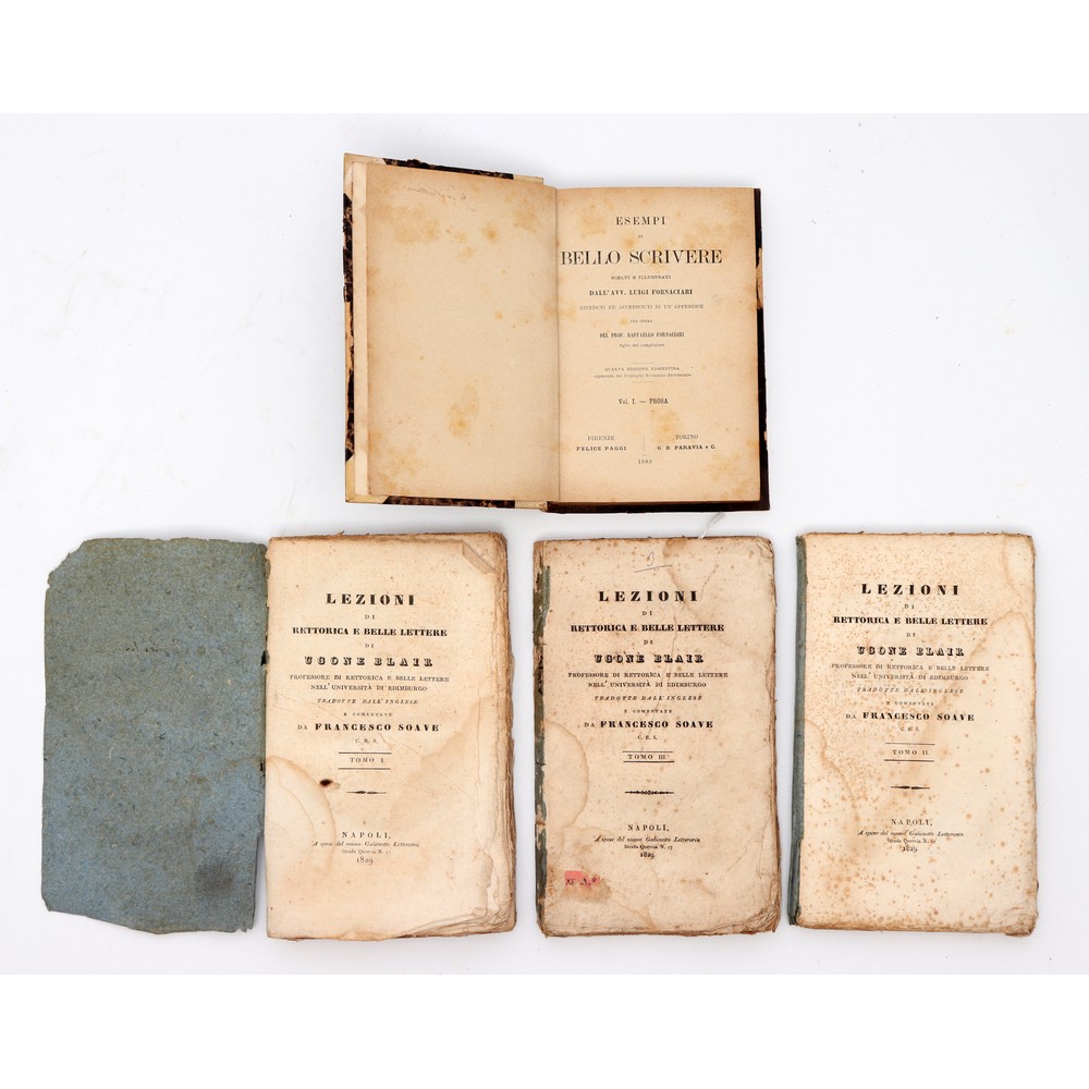 QUATTRO VOLUMI DI RETORICA E SCRITTURA DEL XIX SECOLO: 1) Luigi Fornaciari ESEMPI DI BELLO SCRIVERE, ed. Firenze, Felice Paggi 1883. Legatura coeva in mezza pergamena con angoli e piatti marmorizzati. titoli in oro antro tassello al dorso; fregi e filetti in oro.volume in ottime condizioni. pp. 407, VIII. 2) Francesco Soave LEZIONI DI RETTORICA E BELLE LETTERE, ed. Napoli, Gabinetto Letterario 1829. 3 volumi in 8°. Brossura rustiche, con tagli marginosi e irregolari. Piatto anteriore assente ai volumi secondo e terzo. Pp. 238, (2); 158, (2); 150, (2).