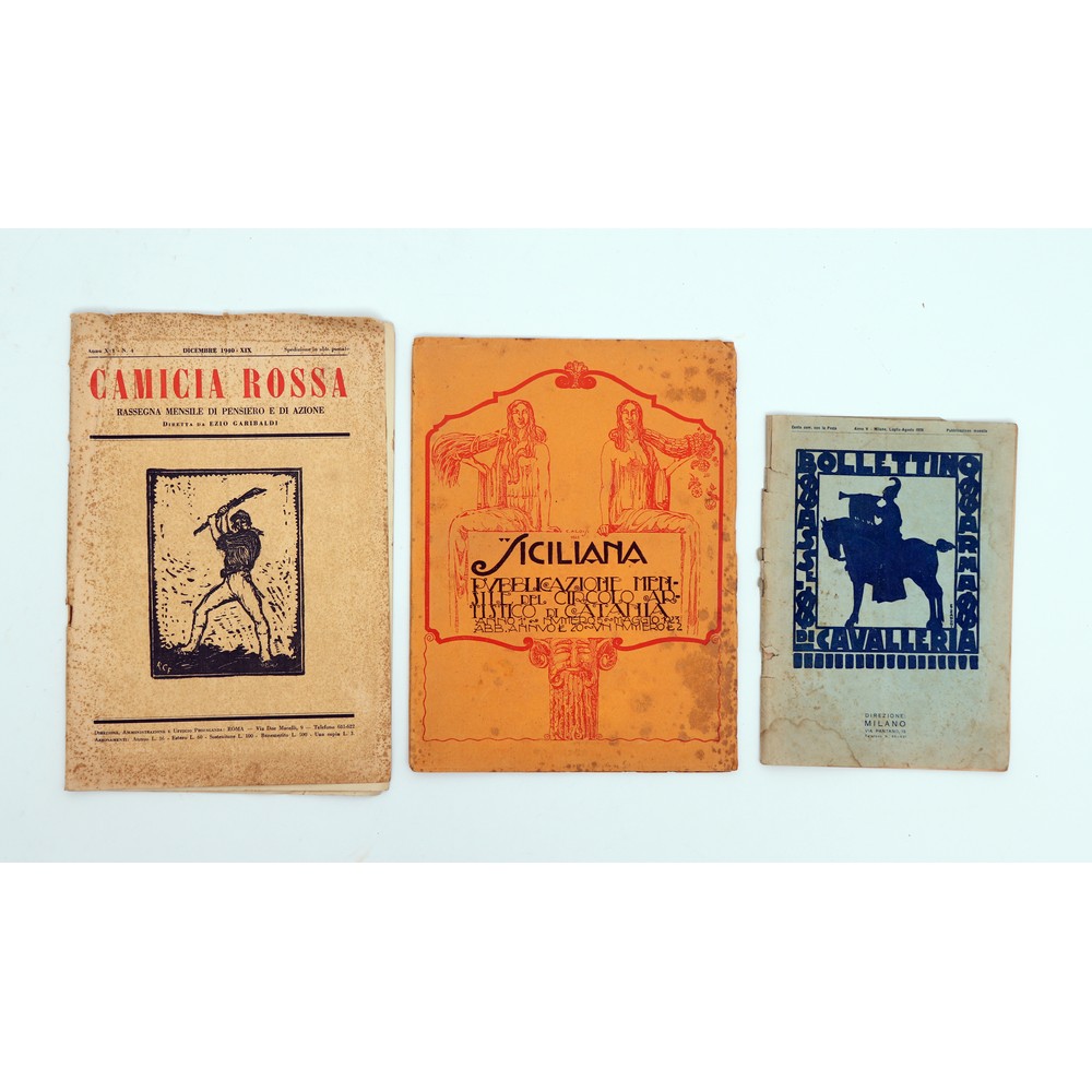 TRE NUMERI DI RIVISTE DELLA PRIMA META’ DEL ‘900: 1) BOLLETTINO DELL’ASSOCIAZIONE DELL’ARMA DI CAVALLERIA, ed. Milano 1926. Anno V, Luglio – Agosto 1926. In 8°. Brossura editoriale. In buone condizioni. Pp. 32. 2) SICILIANA. PUBBLICAZIONE MENSILE DEL CIRCOLO ARTISTICO DI CATANIA, Anno 1, numero 5, Maggio 1923. In 4°. Brossura editoriale. Sporcizie alla brossura ma pagine pulite e ben tenute. Con foto e illustrazioni n. t. Pp. 44. 3) CAMICIA ROSSA. RASSEGNA MENSILE DI PENSIERO E AZIONE, DIRETTA DA EZIO GARIBALDI, Roma 1940. In 4°. Anno XVI, n. 4 Dicembre 1940. Brossura editoriale. Sporcizie alla brossura ma pagine pulite e ben tenute. 23 pagine.