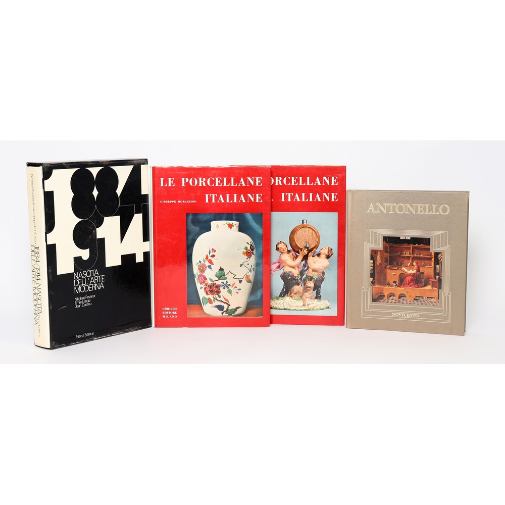 QUATTRO VOLUMI D’ARTE: 1) Morazzoni Giuseppe LE PORCELLANE ITALIANE, ed. Gorlich 1960. Opera in due volumi in formato in 4° (cm 34 x 25). Testo di Saul Levy. Legature editoriali in piena tela azzurra con titoli impressi in oro al dorso. sopracoperte editoriali illustrate. Volumi in perfette condizioni. Pp. 140+398 tavole, b/n e colore. 2) Eugenio Battisti / Riccardo Pacciani ANTONELLO. IL TEATRO SACRO, GLI SPAZI, LA DONNA, ed. Novecento, Palermo 1989. Legatura editoriale in piena tela con fotoapplicazione al piatto e titoli impressi in oro al piatto e al dorso. in ottime condizioni. Cm 28. Collana “Il Labirinto” n. 7. Pp. 306, (2). 3) 1884 / 1914 NASCITA DELL’ARTE MODERNA, ed. Electa Editrice 1962. Legatura editoriale in piena tela e sopracoperta editoriale figurata. Cm 35 x 26. Volume entro custodia editoriale figurata. In ottime condizioni. pp.148, con 333 illustrazioni e 52 tavole a colori applicate alle pagine. € 50,00. Valutazione € 150,00.