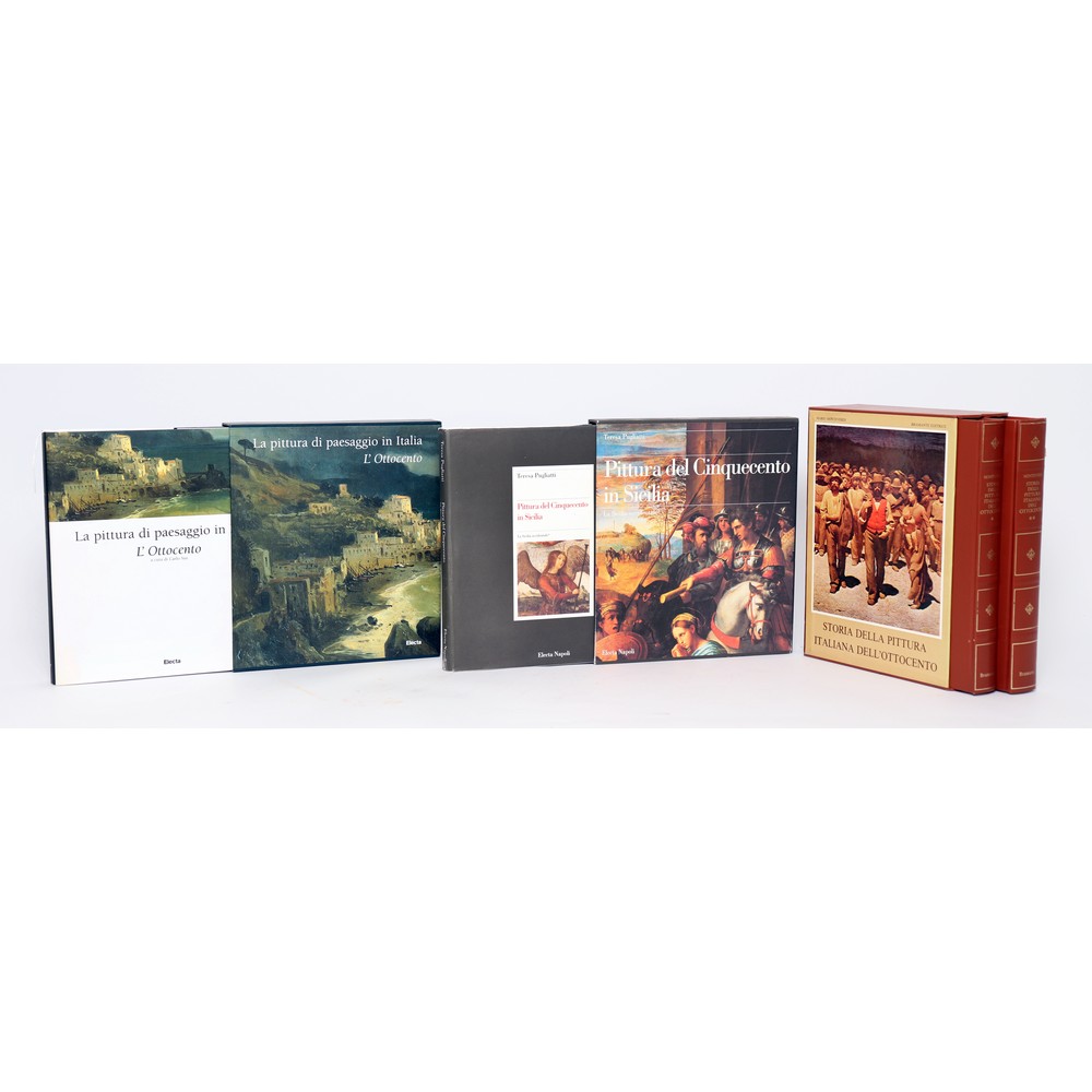 QUATTRO VOLUMI D’ARTE ENTRO COFANETTI: 1) Mario Monteverdi STORIA DELLA PITTURA ITALIANA DELL'OTTOCENTO, ed. Bramante 1984. 2 volumi in 4° entro cofanetto editoriale. Volumi e cofanetto in perfetto stato di conservazione. Legature editoriali in balacron rigido con titoli dorati ai dorsi. Stampati su carta patinata. Pp. XIII, 221; 375.2) Teresa Pugliatti PITTURA DEL CINQUECENTO IN SICILIA. LA SICILIA OCCIDENTALE 1484 - 1557, ed. Electa, Napoli 1998. Cm 29 x 26. Legatura editoriale rigida con sopracoperta editoriale illustrata. Volume entro cofanetto editoriale illustrato. Volume e cofanetto in perfette condizioni di conservazione. Pp. 336.4) Carlo Sisi - a cura di - LA PITTURA DI PAESAGGIO IN ITALIA. L’OTTOCENTO, ed. Electa, Milano 2003. Cm 29 x 26. Legatura editoriale rigida con sopracoperta editoriale illustrata. Volume entro cofanetto editoriale illustrato. Volume e cofanetto in perfette condizioni di conservazione. Pp. 336.
