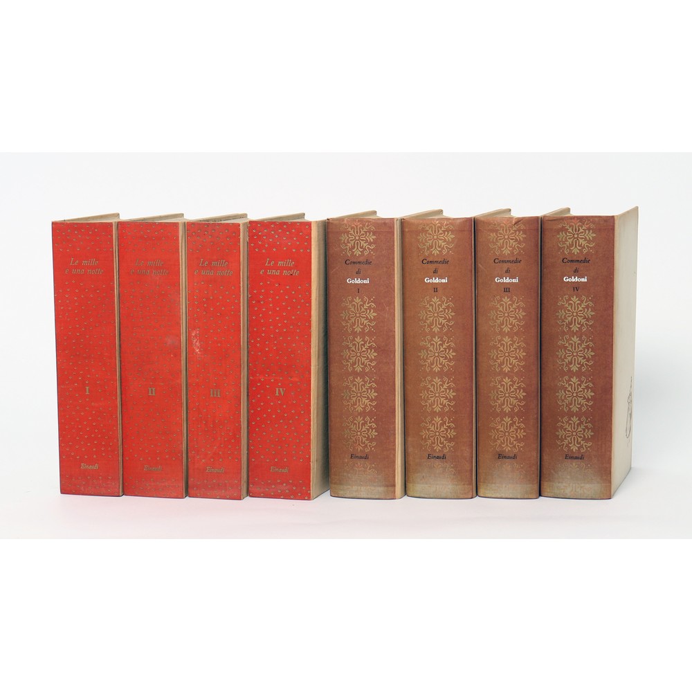 OTTO VOLUMI DI LETTERATURA: 1) QUATTRO VOLUMI de LE MILLE E UNA NOTTE, ed. Einaudi, 1951. Cm 21,5. Prima versione italiana dall'arabo diretta da Francesco Gabrieli. In 4 volumi in 8°. Legatura in tela editoriale rigida. in ottime condizioni. Pp. XXXVII, 730; XI, 758; IX, 658; IX, 787 con numerose tavole f.t. a colori. 2) QUATTRO VOLUMI di Carlo Goldoni COMMEDIE, ed. Einaudi 1952. A cura di Elio Vittorini. Quattro volumi di cm. 21,5, circa 3000 pagine complessive. Con illustrazioni e tavole in nero ed a colori. Legature editoriali in piena tela con decorazioni a dorsi e piatti. Con una poesia manoscritta alla prima carta bianca di ciascun volume. La cerniera del vol. 1 internamente leggermente indebolita, peraltro volumi ben conservati.