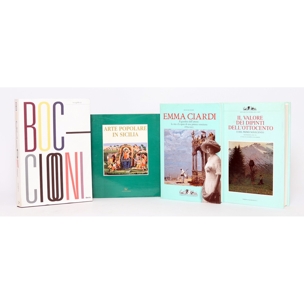 QUATTRO VOLUMI D’ARTE SULLA PITTURA: 1) Myriam Zerbi EMMA CIARDI. IL GIARDINO DELL’AMORE: LA VITA E LE OPERE DI UNA PITTRICE VENEZIANA 1879 – 1933, ed. Umberto Allemandi & C. 2009. Dimensioni cm 32 x 22. Legatura editoriale rigida con sopracoperta illustrata. In ottime condizioni. Pp. 216. 2) Annuari di Economia dell’Arte IL VALORE DEI DIPINTI DELL’OTTOCENTO E DEL PRIMO NOVECENTO. XII EDIZIONE (1994 – 95). A cura di Giuseppe Luigi Marini, ed. Umberto Allemandi & C. 1995. Dimensioni cm 32 x 22. Legatura editoriale rigida con sopracoperta illustrata. In ottime condizioni. Pp. 527 (21). 3) Gabriella D’agostino – a cura di - ARTE POPOLARE IN SICILIA. LE TECNICHE, I TEMI I SIMBOLI, ed. S. f. Flaccovio, Palermo 1991. Formato cm 28 x 25. Brossura editoriale flessibile con ali illustrata. In ottime condizioni. pp. 428. 4) Francesca Rossi – a cura di - BOCCIONI. GENIO E MEMORIA, ed. Electa 2016. Catalogo della mostra tenutasi a Palazzo Reale di Milano dal 23 Marzo al 10 Luglio 2016. Formato cm 33 x 23. Brossura editoriale con sopracoperta editoriale a colori. Volume in perfette condizioni. pp. 307.