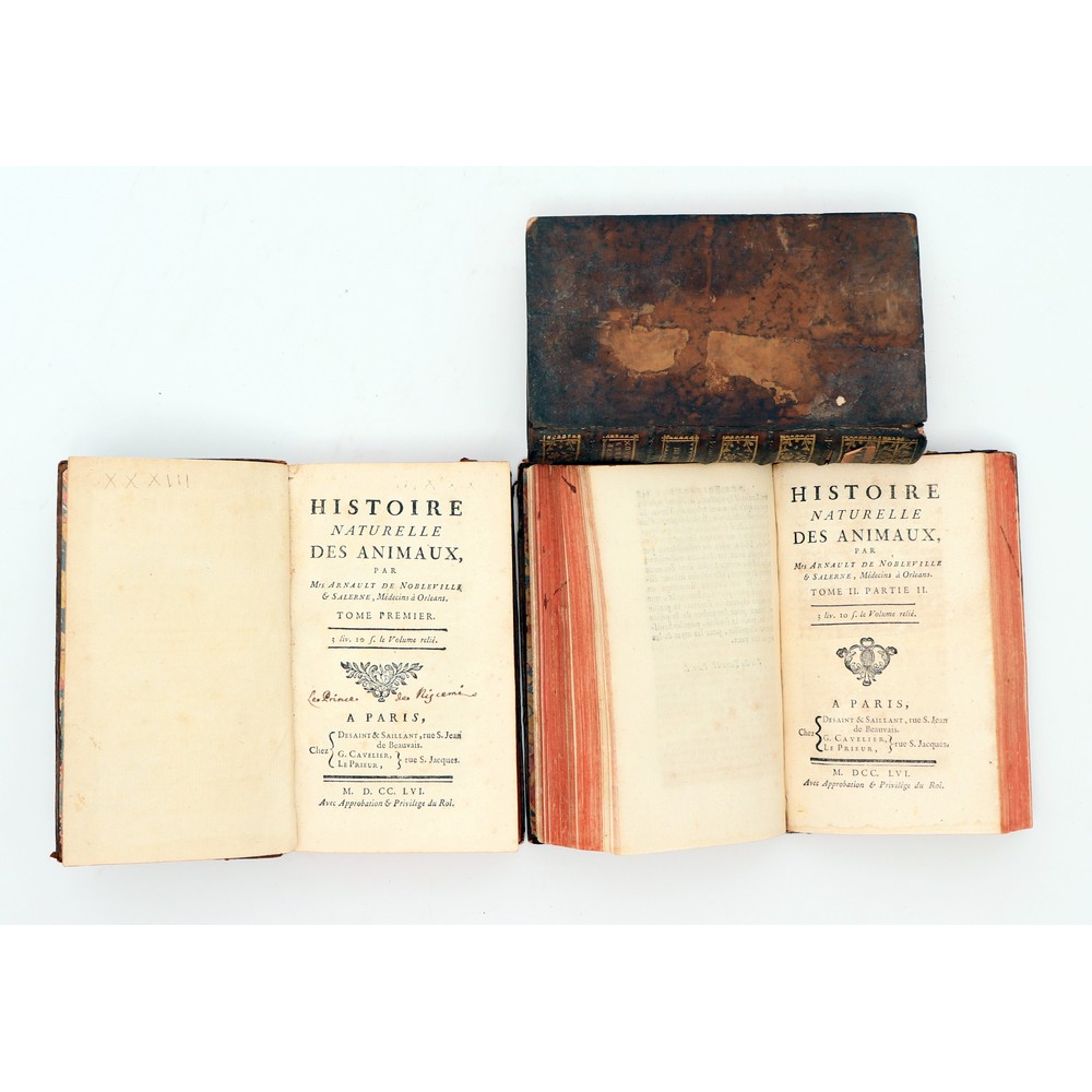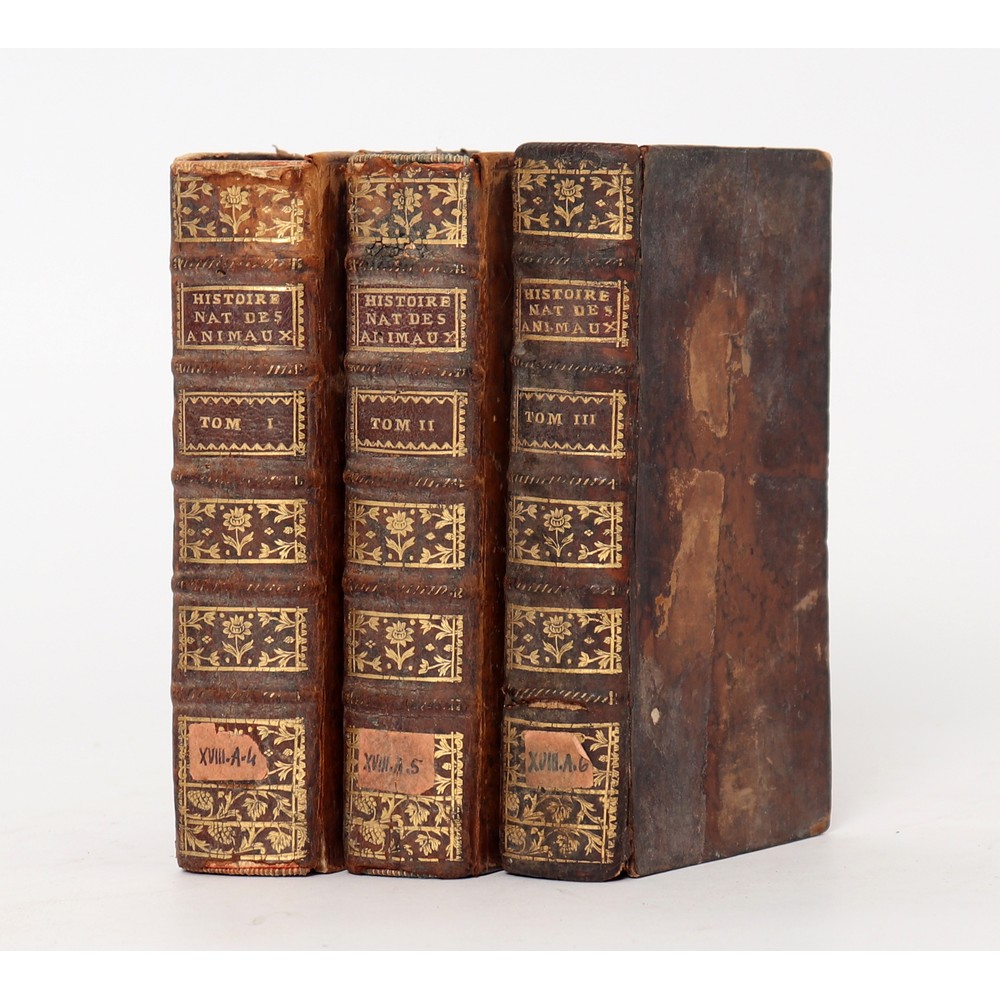 TRE VOLUMI IN LINGUA FRANCESE DEL XVIII SECOLO di Arnault De Nobleville & Salerne HISTOIRE NATURELLE DES ANIMAUX, ed. Paris, Desaint & Saillant MDCCLVI. In 16°. Con belle legature coeve in piena pelle con titoli ai dorsi riccamente fregiati in oro. tagli colorati in rosso. Testatine ed incipit dei capitoli xilografati. Volumi in ottime condizioni. Pp. VI, 651; 347, 318; (2), 604.