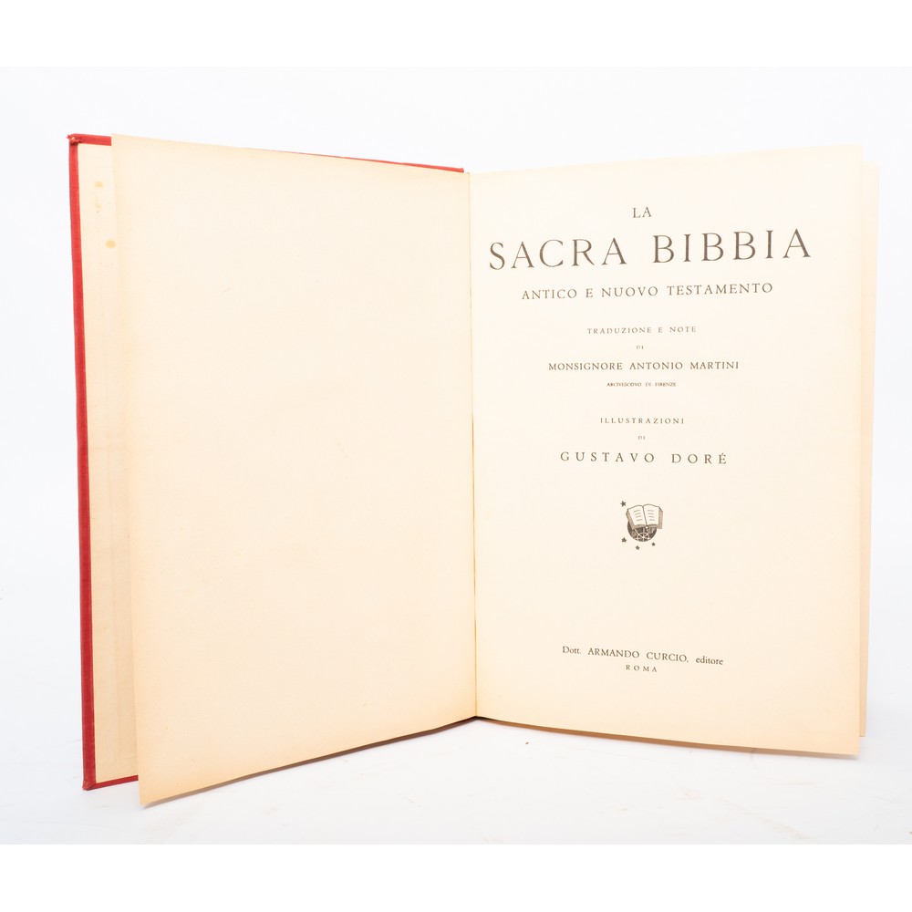 LA SACRA BIBBIA. ANTICO E NUOVO TESTAMENTO … ILLUSTRAZIONI DI GUSTAVO DORÉ, ed. Curcio 1953. In 4°, legatura in piena tela editoriale con titolo in oro al piatto e al dorso. In dicrete condizioni. testo su due colonne. Segnapagine editoriali in stoffa. Pp. 770, (6), con tavole b/n n.t.