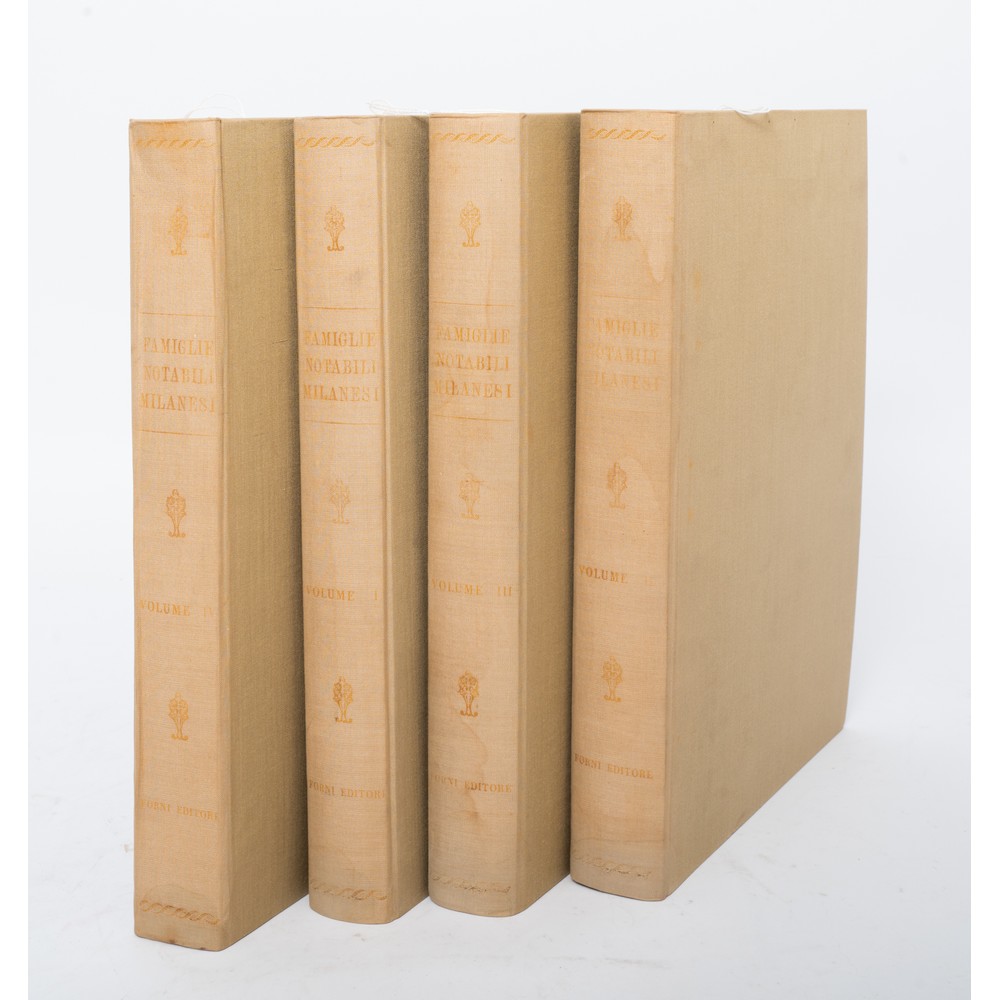 QUATTRO VOLUMI DI STORIA E GENEALOGIA: FAMIGLIE NOTABILI MILANESI. CENNI STORICI E GENALOGICI ed. Forni Editore Bologna 1969, ma ristampa anastatica dell’edizione del 1875 – 1885. In 4 volumi in 4°. In ogni volume le tabelle degli alberi genealogici. Piano dell’opera: volume 1 Felice calvi - storia e genealogia famiglia d'Adda con stemma a tutta pagina fuori testo a colori, Barbiano e Belgiojoso con stemma a colori a tutta pagina fuori testo, Biglia, Clerici con stemma a colori a tutta pagina fuori testo, Colleoni con tavola a tutta pagina fuori testo, Durini con stemma a colori e tavola a tutta pagina fuori testo, Isimbardi con stemma a colori a tutta pagina fuori testo, manzoni con stemma a colori a tutta pagina fuori testo, taverna con stemma a colori a tutta pagina fuori testo, trotti con stemma a colori a tutta pagina fuori testo. Leopoldo Pullè - storia e genealogia famiglia Bertini con tavola a tutta pagina fuori testo, Majoni d'intignano con stemma a colori a tutta pagina fuori testo. Luigi Agostino Casati - storia e genealogia famiglia Giulini con stemma a colori a tutta pagina fuori testo. Damiano Muoni - storia e genealogia famiglia labus con tavola a colori a tutta pagina fuori testo, Mandelli con stemma a colori a tutta pagina fuori testo, Isei ora Oldoffredi con stemma a colori a tutta pagina fuori testo. Redazione - storia e genealogia famiglia Ponti (solo albero genealogico), Visconti Venosta con stemma a colori a tutta pagina fuori testo. Volume 2, Felice calvi - storia e genealogia famiglia Borgia con stemma a colori a tutta pagina fuori testo, Calvi e Melzi con stemma a colori a tutta pagina fuori testo. Monti, Moroni e Resta con stemma a colori a tutta pagina fuori testo; Sfondrati con stemma a colori a tutta pagina fuori testo; Villani con stemma a colori a tutta pagina fuori testo. Leopoldo Pullè - storia e genealogia famiglia Vitaliani Borromeo con stemmi a colori a tutta pagina fuori testo, de Daverio con stemma a colori a tutta pagina fuori testo. Damiano Muoni - storia e genealogia famiglia Cotta con stemma a colori a tutta pagina fuori testo, de Cristoforis on stemma a colori a tutta pagina fuori testo. Volume 3, Felice Calvi - storia e genealogia famiglia Attendolo Bolognini con stemma a colori a tutta pagina fuori testo; Borri, Brambilleschi e Carminati con stemma a colori a tutta pagina fuori testo; Brambilla, Cajrati, Cusani con stemma a colori a tutta pagina fuori testo; Gallerani, Ghirlanda e Landriani con stemma a colori a tutta pagina fuori testo; Maggi e Olgiati con tavola a colori a tutta pagina fuori testo; Silva con stemma a colori a tutta pagina fuori testo. Volume 4, Emilio Belgiojoso - storia e genealogia famiglia Brivio con stemma a colori a tutta pagina fuori testo. Felice Calvi - storia e genealogia famiglia Carcano con stemma a colori a tutta pagina fuori testo; Casati con stemma a colori a tutta pagina fuori testo, Medici di Marignano con stemma a colori a tutta pagina fuori testo. Volumi in ottime condizioni.