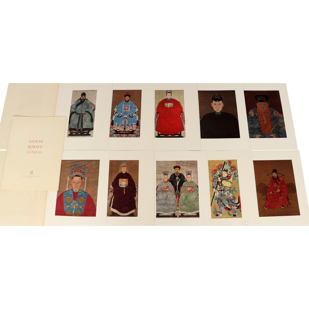 ANTICHI RITRATTI CINESI ed. Officine Grafiche Ricordi, Milano 1972. 1a Edizione. Formato in folio (425 x 325 mm). Non impaginato, cofanetto editoriale foderato in seta con caratteri cinesi entro custodia in cartone contenente 10 ritratti a colori stampati su seta e opacizzati. Antichi ritratti cinesi: Lon Suen (Sung. X-XIII), Imperatore (Ming XIV-XV), Ritratto di Monaco taoista (Ming XIV-XVII), Ritratto di un'anziana dama di corte (Ming XIV-XVII), Ritratto di una giovane dama (Ch'ing XVII-XVIII), Ritratto di una dama in costume di corte (Ch'ing XVII-XVIII ), Ritratto di alto personaggio in abito di corte (Ch'ing XVIII), Dama di corte moglie del mandarino (Ch'ing XVIII-XIX), Ritratto del mandarino con le sue due mogli (Ch'ing XVIII), Yan Tien dei guardiani del cielo (Ming XIV-XVII). Testo in lingua italiana. In ottime condizioni.