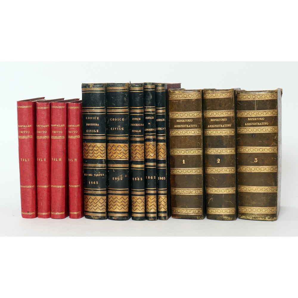 DODICI VOLUMI DI DIRITTO DEL REGNO DELLE DUE SICILIE E DEL REGNO D’ITALIA EDITI NEL XIX SECOLO: 1) REPERTORIO AMMINISTRATIVO OSSIA COLLEZIONE DI LEGGI, DECRETI, REALI RESCRITTI, MINISTERIALI, REGOLAMENTI E ISTRUZIONI SULL’ AMMINISTRAZIONE CIVILE DEL REGNO DELLE DUE SICILIE, ed. Palermo, Dalla Reale Stamperia, 1841. 3 volumi in 8°. Belle legature coeva in mezza pelle con titoli, filetti ornati e fregi in oro al dorso. Tagli spruzzati. Trascurabili tracce d'uso con naturali fioriture sparse e qualche brunitura del tempo, alone di sporcizia al taglio inferiore limitato al vol.1. Esemplari comunque ben conservati. Imponente raccolta di legislazione amministrativa riferita al periodo 1806-1840, centrale per l'evoluzione istituzionale del regno poggiata sopra la legge sull'amministrazione civile promulgata da Ferdinando I il 12 Dicembre 1816. Opera non comune. Pp. 932; 824; 1177 (1), LXXVI. 2) Luigi Giampallari DRITTO ECCLESIASTICO SICOLO, ed. Palermo, Lorenzo Dato 1828 – 1829. Quattro volumi in 16°. Legature novecentesche in mezza tela con angoli e piatti cartonati. Volumi in ottime condizioni. Pp. (6), 272; 288; 249; 236. 3) CINQUE CODICI DEL REGNO D’ITALIA: I, CODICE CIVILE DEL REGNO D’ITALIA, con i due Regi Decreti di attuazione. Pp. VIII, 527, 48, 17, (2). II, CODICE DI PROCEDURA CIVILE DEL REGNO D’ITALIA. Con i tre Regi Decreti attuativi. Pp. (2), 309, 80, 125, 143. III, CODICE DI COMMERCIO DEL REGNO D’ITALIA, con due Regi Decreti attuativi. Pp. (2), 225, 7, 4. IV, CODICE DI PROCEDURA PENALE DEL REGNO D’ITALIA, con due Regi Decreti attuativi. Pp. 304, 11, 12.V, CODICE PER LA MARINA MERCANTILE DEL REGNO D’ITALIA, con due Regi Decreti attuativi. Pp. (2), 136, 36, 10, (2). I volumi sono tutti in eleganti legature dei primi del ‘900, in mezza pelle con piatti telati rigidi e titoli ed eleganti fregi in oro ai dorsi. Volumi in ottime condizioni. I volumi sono stati pubblicati nel 1865, a Torino, presso la Stamperia Reale. Cinque volumi in 8°.