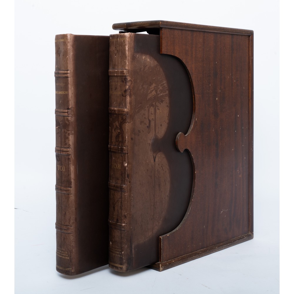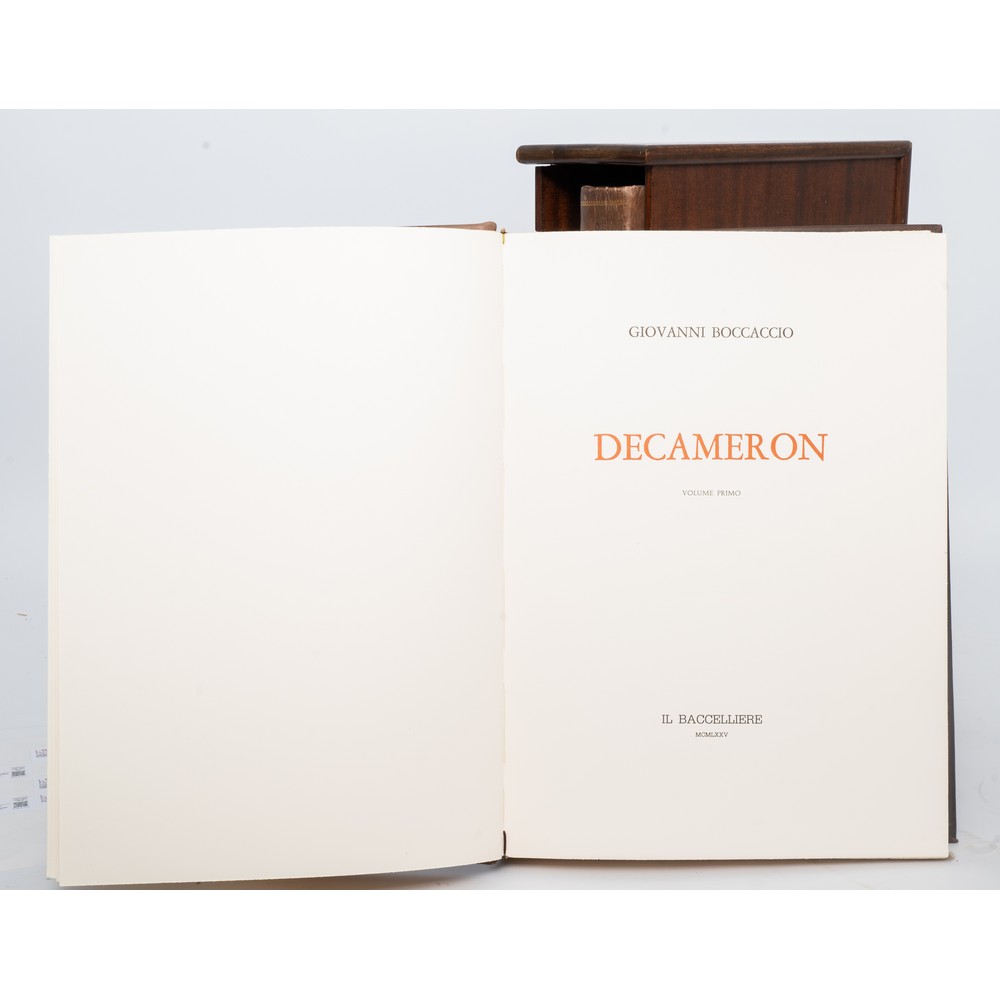 DUE VOLUMI IN COFANETTO: Giovanni Boccaccio DECAMERON, ed. Il Baccelliere 1975. In folio max. Opera pubblicata nel VI centenario della morte di Boccaccio. Testo critico di Vittore Branca. Prefazione di Ferruccio Olivi. Opera completa in 2 volumi illustrati con 42 tavole a piena pagina di L. Vespignani, F. Clerici, R. Brindisi, A. Sassu, M. Campigli, M. Maccari, G. Omiccioli, A. Salvadori, C. Mattioli, G. Migneco, U. Attardi, M. Mazzacurati, A. Ziveri, D. Bartoli, F. Pirandello, R. Guttuso, G. Zigaina, Q. Martini, G. Manzù, C. Levi e molti altri. I Capilettera sono stati disegnati appositamente da Domenico Purificato. Edito in 1000 esemplari numerati in oro a cifre arabe. Il nostro è il n. 680. Legatura editoriale in pieno vitello con nervature ai dorsi. Bella edizione contenuta entro cofanetto ligneo editoriale appositamente realizzato a mano. Pp. XI, 341 a numerazione continua, (12) con 42 tavv. f.t. a colori. Volumi in ottime condizioni.
