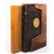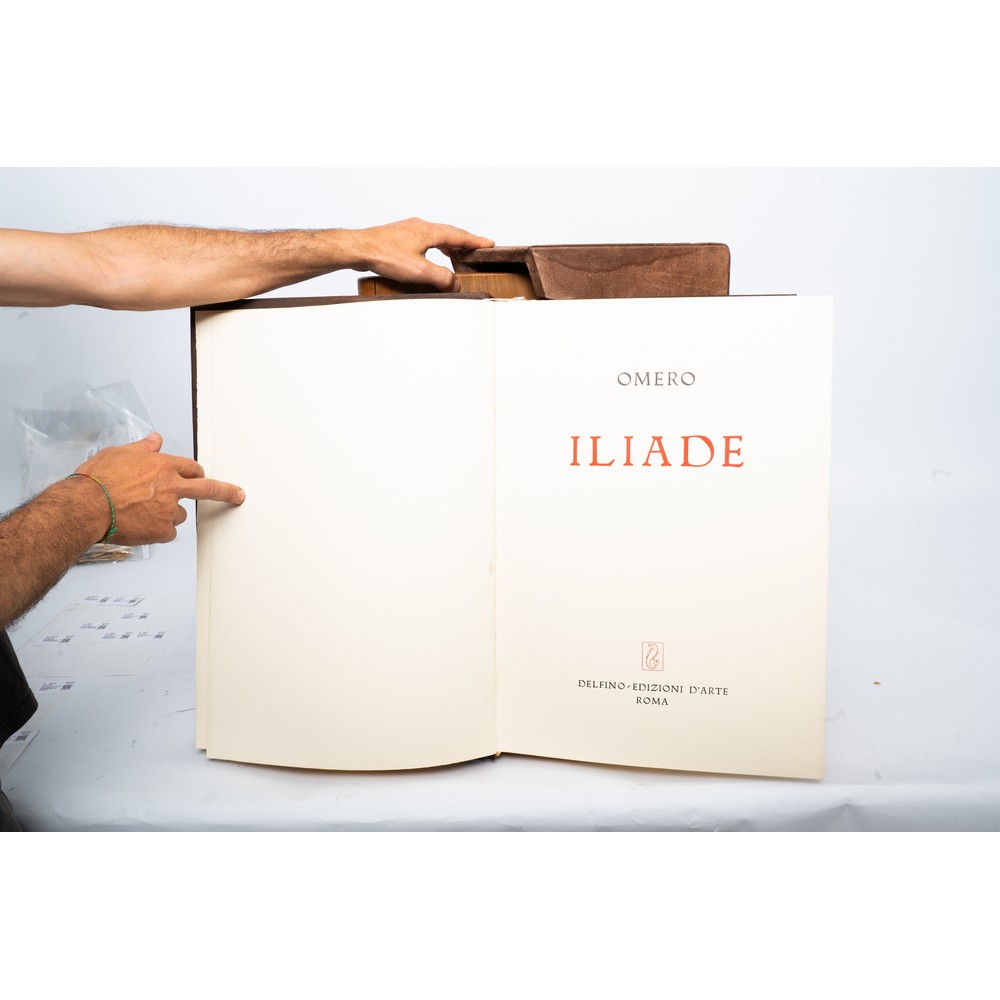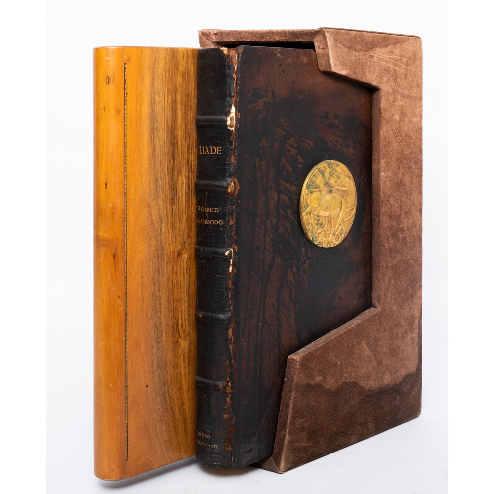 DUE VOLUMI IN FOLIO: Omero ILIADE, ed. Delfino - Edizioni d’Arte, Roma 1976. Due volumi in folio max. (mm. 500x355). Episodi scelti e tradotti da Salvatore Quasimodo. Legatura editoriale alla "Cappuccina" in pelle naturale di capra anticata, interamente artigianale, con bassorilievo in bronzo dorato realizzato dallo scultore Guido Veroi, applicato al piatto anteriore. Il testo, di pp. 147, (11), è ornato, al termine di ogni capitolo, da figure che rappresentano autentici soggetti di età micenea. Gli episodi dell’Iliade scelti da Quasimodo sono stati stampati in italiano e in greco. Unito, delle stesse dimensioni, un contenitore in legno a forma di libro, che raccoglie 26 tavole a colori (protette da velina) realizzate da Giorgio De Chirico per illustrare i 24 libri dell’opera (come da Indice). Edizione di gran pregio stampata su carta realizzata a mano delle Cartiere Miliani di Fabriano, in tiratura di 1500 esemplare numerati. In nostro è il n. 1467. In ottimo stato.