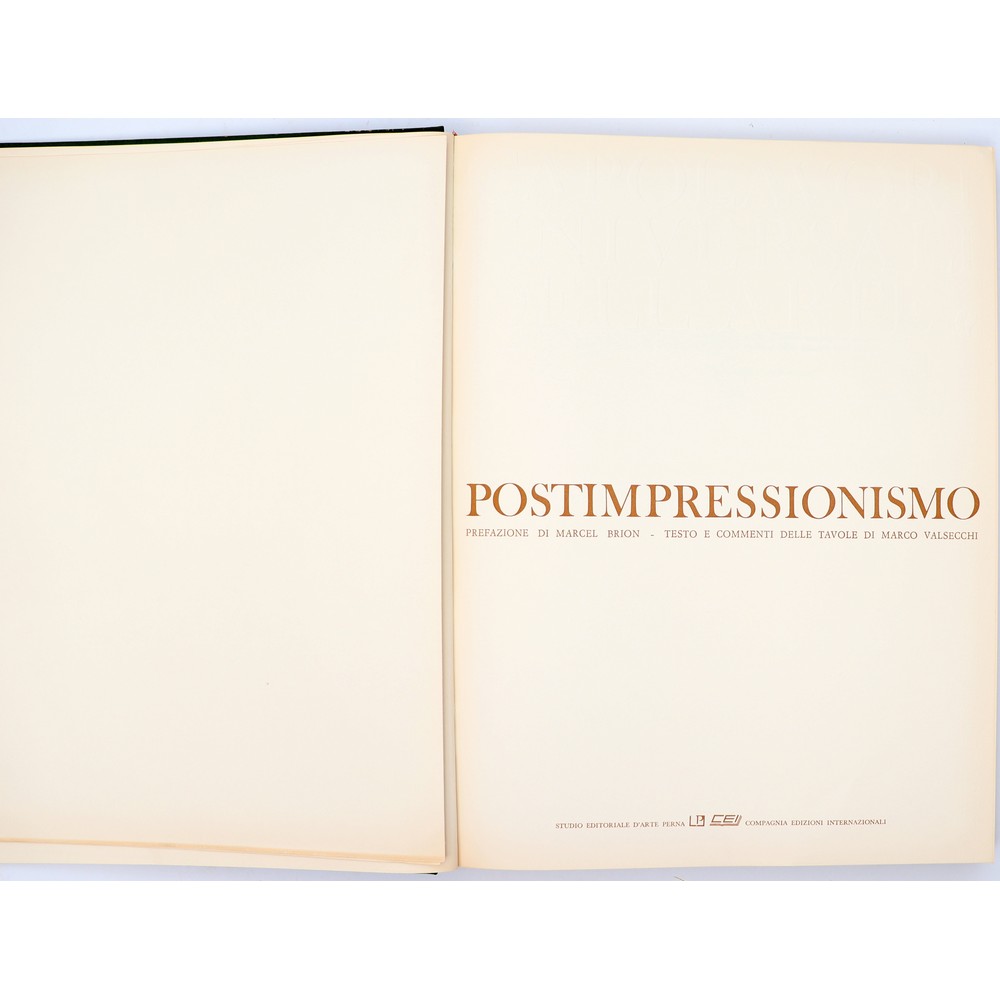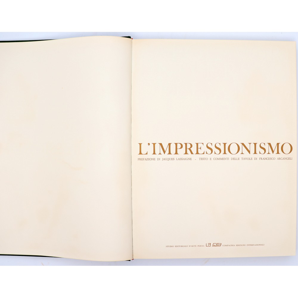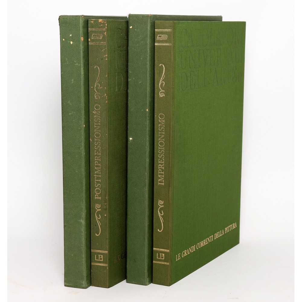 DUE VOLUMI in formato atlantico: 1) Jacques Lassaigne / Francesco Arcangeli L’IMPRESSIONISMO, ed. Milano Studio editoriale d'arte Perna / Compagnia Edizioni internazionali, 1964. Cofanetto editoriale realizzato in edizione numerata di 750 esemplari; il nostro è il n. 273. Volume corredato da 24 tavole a colori stampate su carta d'impasto pregiato e protette da carta velina del Giappone. Presente la tavola separata fuori testo. Pp. 200 circa nn. Collana “Capolavori Universali dell'Arte” diretta da Garibaldo Marussi.2) Marcel Brion / Marco Valsecchi POSTIMPRESSIONISMO, ed. Milano Studio editoriale d'arte Perna / Compagnia Edizioni internazionali, 1964. Cofanetto editoriale realizzato in edizione numerata di 750 esemplari; il nostro è il n. 273. Volume corredato da 24 tavole a colori stampate su carta d'impasto pregiato e protette da carta velina del Giappone. Presente la tavola sciolta a parte. Pp. 200 circa nn.