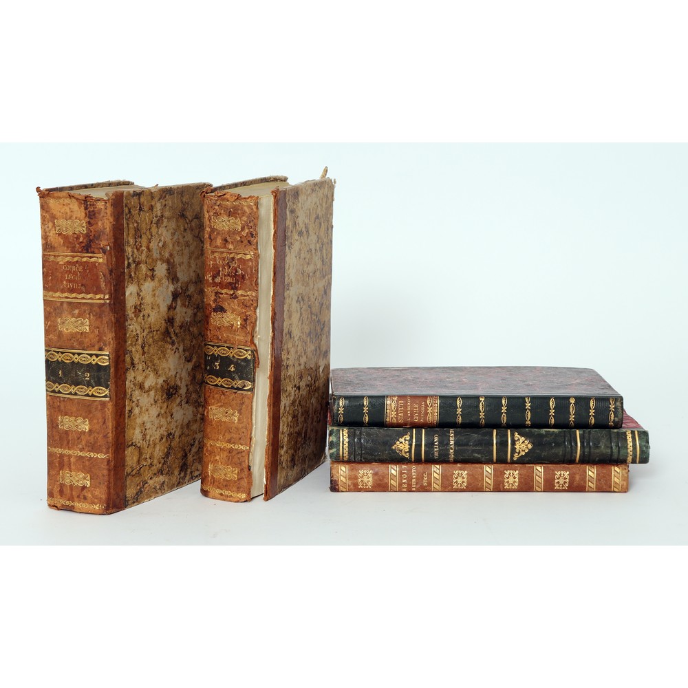 CINQUE VOLUMI DI DIRITTO DEL REGNO DELLE DUE SICILIE: 1) CODICE PER LO REGNO DELLE DUE SICILIE, PARTE PRIMA LEGGI CIVILI, ed. Palermo, Pedone e Muratori 1832. Due volumi in 8° che contengono quattro tomi. Legatura coeve in mezza pelle con piatti marmorizzati e titoli, fregi e filetti in oro ai dorsi. Piatto e dorso del volume 2 slegati. Leggere fioriture sparse e leggere bruniture solo in alcune pagine. I volumi si presentano in buone condizioni. Pp. 317, 507, (4);357, 190, (2), 135, 26. 2) STATUTI DELL’ AMMINISTRAZIONE CIVILE IN SICILIA, ed. ( Nella Reale Stamperia 1825). Manca il frontespizio. Aggiunte agli Statuti dell'amministrazione civile. Luogo di pubblicazione presunto: Palermo. La data di pubblicazione presunta si ricava da p. 229. In 8°. Legatura in mezza pelle coeva con piatti marmorizzati e titoli e fregi in oro al tassello al dorso. tagli colorati. Manuale di diritto amministrativo per il Regno delle Due Sicilie con corredo di decreti, modelli per pratiche amministrative ecc.. pp. 371 con 8 tavole più volte ripiegate. In ottime condizioni. 3) Antonino Giuliano REGOLAMENTO PER GLI UFFIZIALI DELLO STATO CIVILE, ed. Palermo, Pietro Morvillo 1852. Legatura in mezza pelle coeva con piatti marmorizzati e titoli e fregi in oro al dorso. tagli spruzzati. in ottime condizioni. Pp. 336. 4) Giuseppe Puglisi TRATTATO DEL RETRATTO SUCCESSORIO PER SAV. BENOIT, ed. Palermo, Domenico Maccarrone 1852. Legatura in mezza pelle coeva con piatti marmorizzati e titoli e fregi in oro al dorso. tagli spruzzati. In ottime condizioni. Pp. 318.