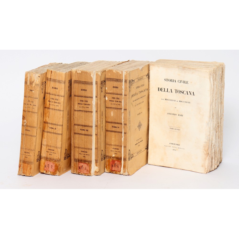 CINQUE VOLUMI di Antonio Zobi STORIA CIVILE DELLA TOSCANA DAL MDCCXXXVII AL MDCCCXLVIII, ed. Firenze, presso Luigi Molini 1850 – 1852. Opera completa in 5 volumi in 8°. Brossure editoriali. Assente brossura anteriore del Vol. Quinto. Tagli marginosi. Volumi con pagine per la maggior parte ancora intonse. Tutti i volumi in discrete condizioni. Solo alcune sparse fioriture alle pagine e alcune leggere gore. Pp. XIX, 423, 108; 577, 270 con due carte più volte ripiegate f. t.; 763, 380; 634, 360; 824, 475 con una carta più volte ripiegata f. t.