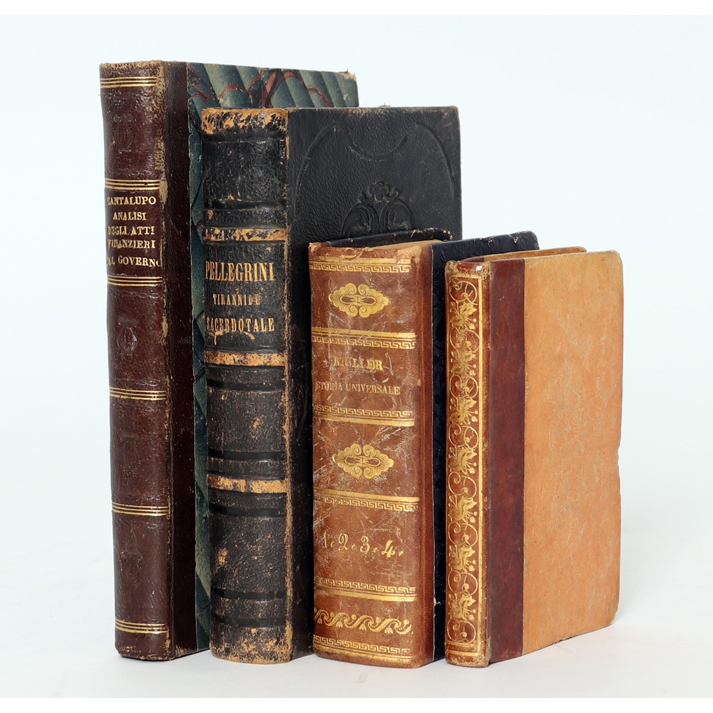 QUATTRO VOLUMI DI VARIA DEL XIX SECOLO: 1) Giuseppe Pellegrini DELLA TIRANNIDE SACERDOTALE ANTICA E MODERNA E DEL MODO DI FRENARLA, ed. Firenze, Felice Le Monnier 1861. In 8° antico. Bella legatura editoriale in piena pelle rigida con impressioni a secco ai piatti, nervature e titoli in oro al dorso. volume in ottime condizioni. Ex libris di appartenenza del 1864 al contropiatto e segni di appartenenza successivi al foglio di guardia. Pp. 525. 2) Benedetto Cantalupo QUADRO ED ANALISI DEGLI ATTI DEL GOVERNO CHE COSTITUISCONO IL SISTEMA FINANZIERO PER LE DUE SICILIE, ed. Napoli, Marotta Vanspandoch e C. 1824. in 8°. Legatura coeva in mezza pelle con piatti marmorizzati e titoli e filetti in oro al dorso. tagli colorati. Leggere bruniture del tempo in alcune pagine ma volume in ottime condizioni. Estremamente raro. Pp. 279. 3) BREVIARIUM ADVOCATORUM SEU ROTUNDIORES JURIS REGULAE SECUNDUM ORDINEM MATERIARUM ALPHABETICUM DISPOSITAE, ed. Napoli, Tipografia Simoniana 1859. In 24°. Legatura coeva in mezza pelle con piatti cartonati floreali e fregi floreali in oro al dorso. in ottime condizioni. Raro. Pp. VII, 202. 4) Giovanni de Muller STORIA UNIVERSALE, ed. Napoli, Marotta e Vanspandoch 1850. In 24°. 4 volumi in un unico tomo. Legatura coeva in mezza pelle con piatti cartonati floreali e fregi floreali,filett e titoli in oro al dorso. in ottime condizioni. 190; 207; 183; 199. Pp. VII, 202.