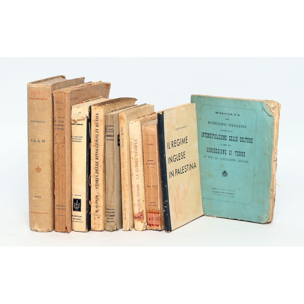 DIECI VOLUMI DI VARIA DEL XIX SECOLO E L’INIZIO DEL XX: 1) Ivanoe Bonomi LEONIDA BISSOLATI E IL MOVIMENTO SOCIALISTA ITALIANO, ed. Milano, Cogliati 1929. In 8°. Brossura editoriale marginosa con tagli marginosi anch’essi. Volume in ottime condizioni. Pp. 232.2) Marco Slonim STORIA DELLE RIVOLUZIONI IN RUSSA 1700 - 1917, ed. Milano, Monanni 1929. In 8°. Brossura editoriale figurata con tagli marginosi. Segni di fioriture alla coperta ed in alcune pagine ma volume in ottime condizioni. Pp. 286, (2). 3) Benito Mussolini LA NUOVA POLITICA DELL’ITALIA, ed. Milano, Alpes 1924. Vol. II. A cura di Amedeo Giannini. In 8°. Brossura editoriale figurata e marginosa con tagli marginosi anch’essi. Volume in ottime condizioni. Pp. 230, (8). 4) Guglielmo Ferrero LA GUERRA EUROPEA, ed. Milano, Rava 1915. In 8°. Brossura editoriale figurata con tagli marginosi. Volume in buone condizioni. Pp. XI, 288. 5) Justus V. MACCHI DI CELLERE ALL’AMBASCIATA DI WASHINGTON, MEMORIE E TESTIMONIANZE, ed. Bemporad, Firenze 1920. In 8°. Brossura editoriale con tagli marginosi. Volume in buone condizioni. Pp. 262.6) Cesare Balbo STORIA D’ITALIA SOTTO AI BARBARI, ed. Firenze, Le Monnier 1856. In 8° piccolo. Brossura editoriale. Tagli irregolari e marginosi. Pagine ancora intonse. Qualche brunitura alle pagine ma volume in buone condizioni. Pp. 498, (1). 7) Gert Winsch IL REGIME INGLESE IN PALESTINA, ed. Berlino 1940. Brossura editoriale. Coperta con qualche sporcizia ma volume in ottime condizioni. Pp. 88 con fotografie in b/n fuori testo. 8) RACCOLTA DELLE DISPOSIZIONI LEGISLATIVE EMANATE PER LA INTENSIFICAZIONE DELLE COLTURE E PER LA CONCESSIONE DI TERRE AD ENTI ED ASSOCIAZIONI AGRARIE, ed. Roma, Tipografia delle Mantellate 1920. In 8°. Brossura editoriale con tagli marginosi anch’essi. Piccole gore al taglio basso ma volume in ottime condizioni. Pp. 143, (2). 9) Josef Bernhart IL VATICANO POTENZA MONDIALE, ed. Milano, Bompiani 1941. Brossura editoriale con sopracoperta editoriale figurata con ali. Volume in ottime condizioni. Pp. 462. 10) ALBUM NAZIONALE A RICORDO DELLA SOLENNE MANIFESTAZIONE DI PROTESTA PER L’ODIOSO ATTENTATO CONTRO SUA MAESTA’ IL RE, ed. Roma, Eredi Botta 1879. In 8° grande. Legatura editoriale rigida figurata. Fotografia della famiglia reale in antiporta protetta da velina. Volume con qualche piccola sporcizia, ma in ottime condizioni. Pp. XVI, 656.