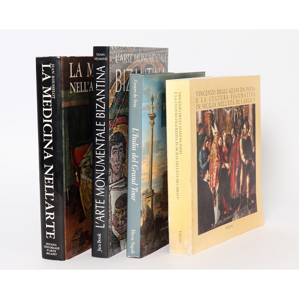QUATTRO VOLUMI D’ARTE: 1) Tania Velmans L’ARTE MONUMENTALE BIZANTINA, ed. Jaka Books 2006. Volume di cm 33,5 x 25. Legatura editoriale rigida con sopracoperta editoriale illustrata. Volume in perfette condizioni. pp. 323. 2) Teresa Viscuso VINCENZO DEGLI AZANI DA PAVIA E LA CULTURA FIGURATIVA IN SICILIA NELL'ETÀ DI CARLO V, ed. Ediprint, Palermo, 1999. Cm 28 x 25. Brossura editoriale con ali. Volume in perfette condizioni. Pp. 510. 3) Jean Rousselot – a cura di - LA MEDICINA NELL’ARTE, ed. Silvana Editoriale d'arte, Milano s. d. cm 32 x 27. Legatura editoriale in piena tela con titoli in oro al piatto e al dorso. con sopracoperta editoriale illustrata. Pp. 330. 4) Cesare De Seta L'ITALIA DEL GRAND TOUR. DA MONTAIGNE A GOETHE, ed. Electa, Napoli 1992. Cm 29 x 26. Legatura editoriale in piena tela rigida con sopracoperta editoriale illustrata. Volume in ottime condizioni. pp. 247.