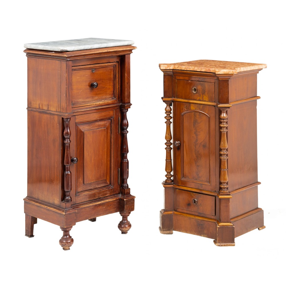 Due comodini in legno di noce di cui uno con sportello ed un cassetto con piano in marmo non coevo ed un comodino con sportello e due cassetti con marmo rosso di Verona.