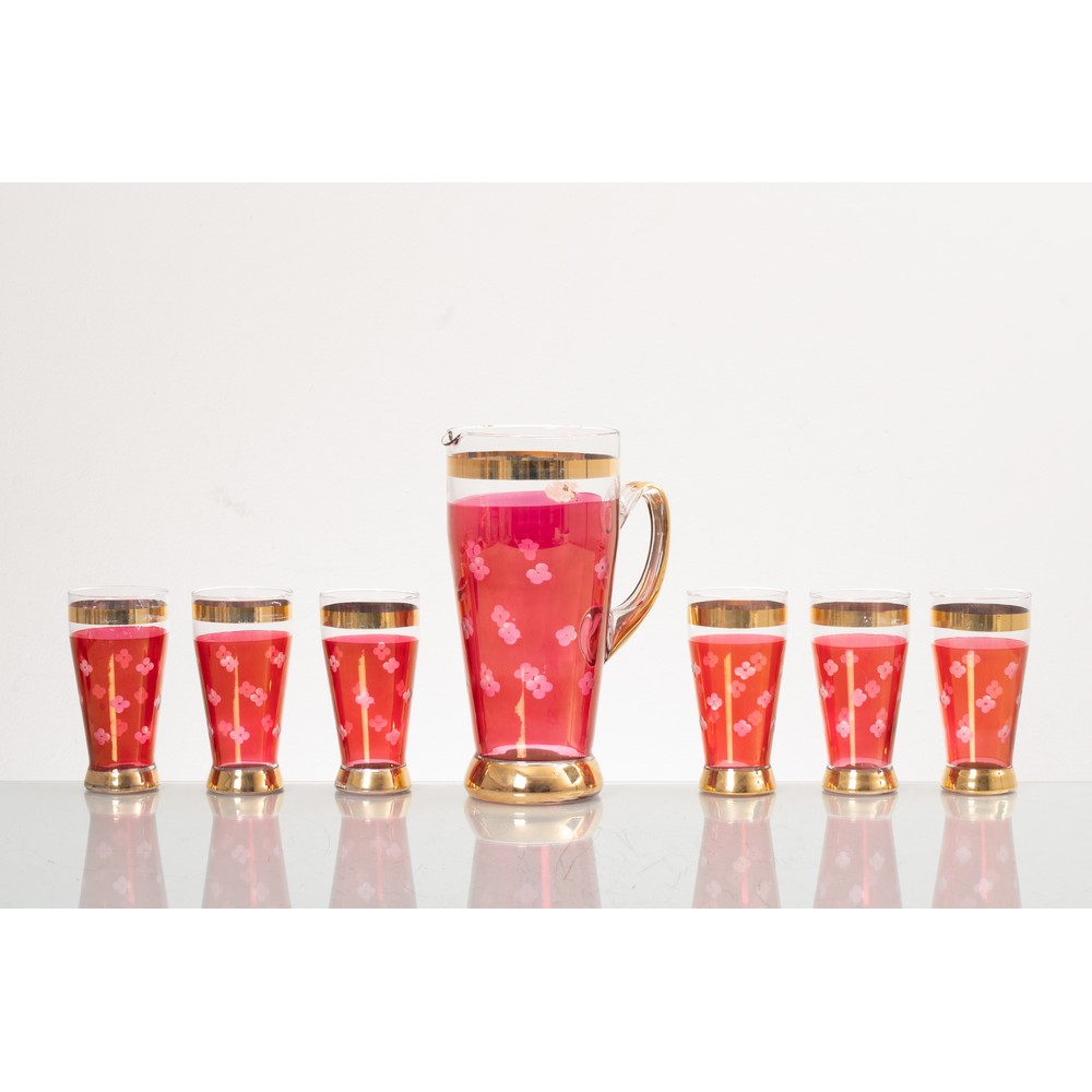 SERVIZIO in vetro colorato e dorato composto da brocca e sei bicchieri.