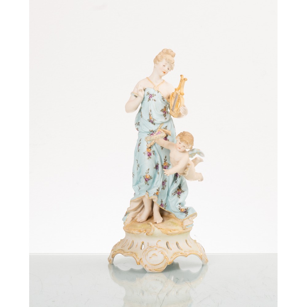 Scultura in biscuit decorato raffigurante "Figura femminile con Angelo".