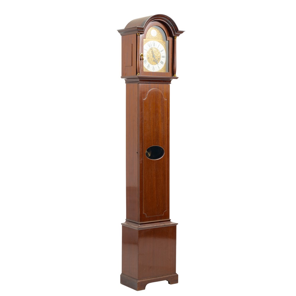 Orologio a torre in legno di noce con quadrante in metallo dorato.
