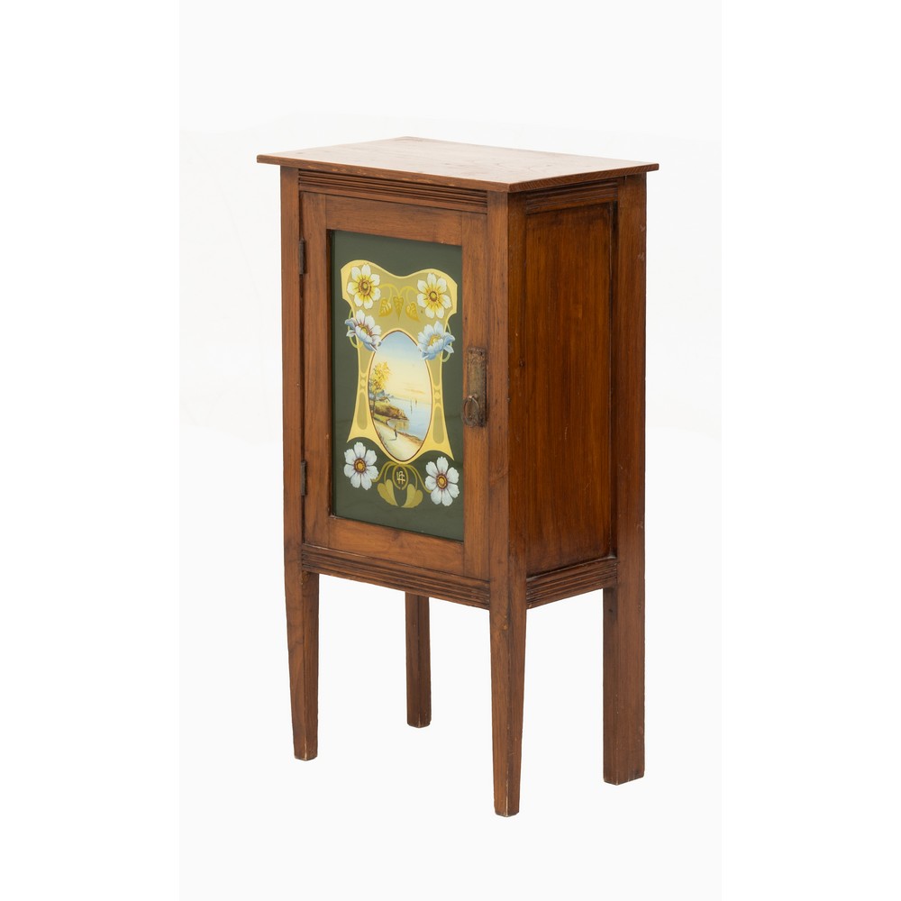 Piccolo mobile ad un'anta in legno di noce con vetro dipinto a mano, periodo Liberty.