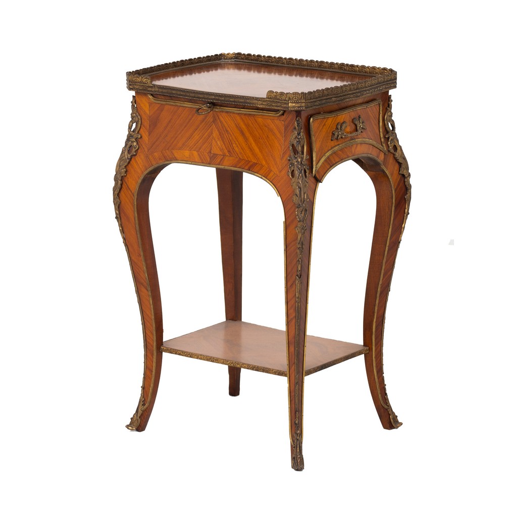 Tavolino di gusto francese in bois de rose con tiretto/scrittoio, riccamente guarnito da bronzi.