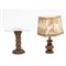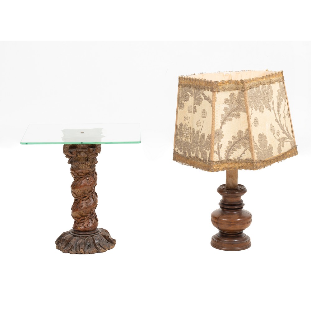 Colonna in legno intagliato con capitello trasformato a tavolino con lume in legno di noce del XX secolo e paralume.