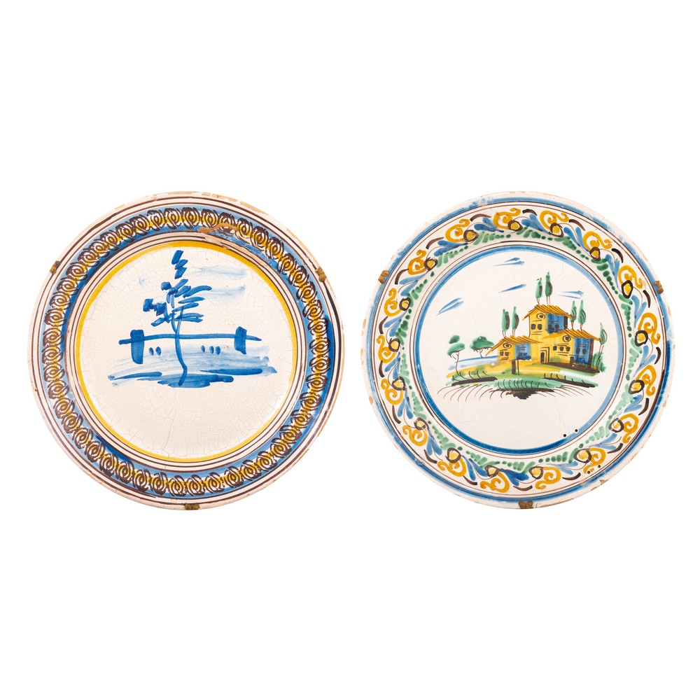 Due fangotti in ceramica smaltata e decorata (usure, filè e restauri) e grande piatto in ceramica smaltata e decorata nei toni del giallo a motivo floreale e fogliaceo.