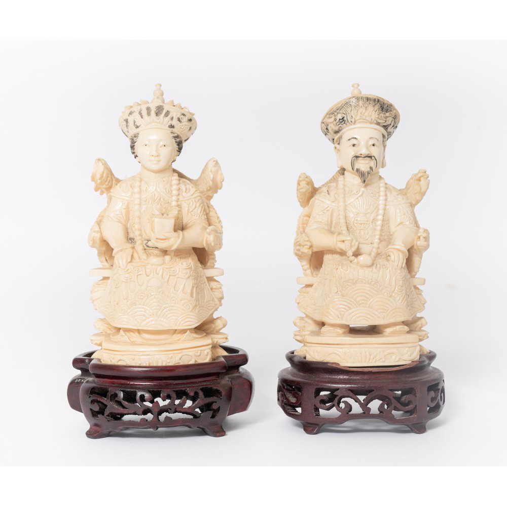 Coppia di sculture in avorio raffiguranti "Dignitari" con basi in legno ebanizzato. Le opere sono corredate da certificato Cites.