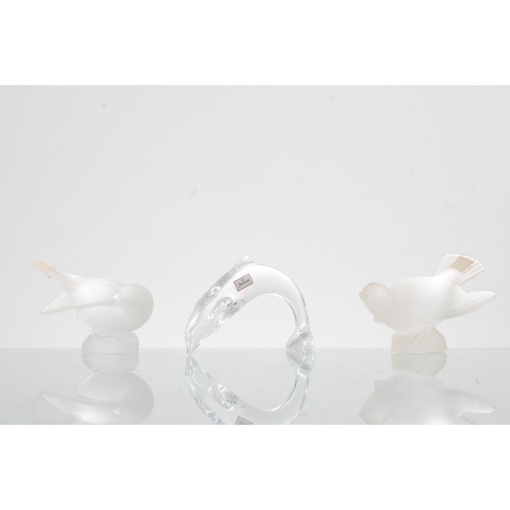 Due piccole sculture in cristallo raffigurante "Colombi" e scultura in cristallo raffigurante "Delfino" (usure e mancanze).
