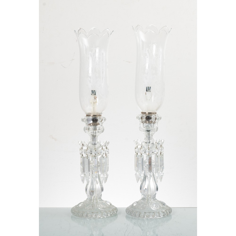 Coppia di lumi in cristallo ad una luce e pendenti.