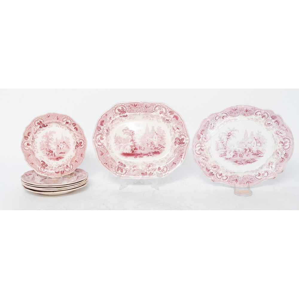 Sei piatti e due vassoi in porcellana Davenport decorata con designi a motivo paesaggistico.