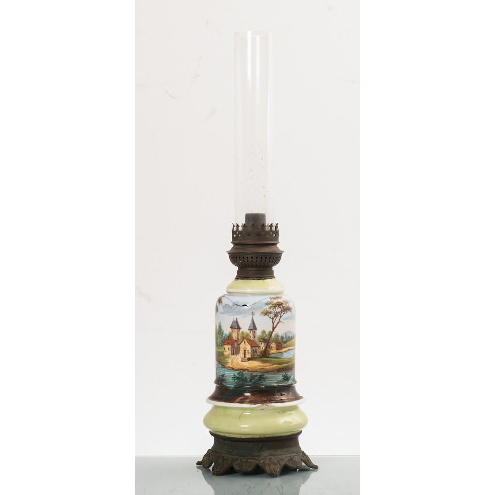 Lume a petrolio in porcellana decorata e dipinta raffigurante "Paesaggio con caseggiati".
