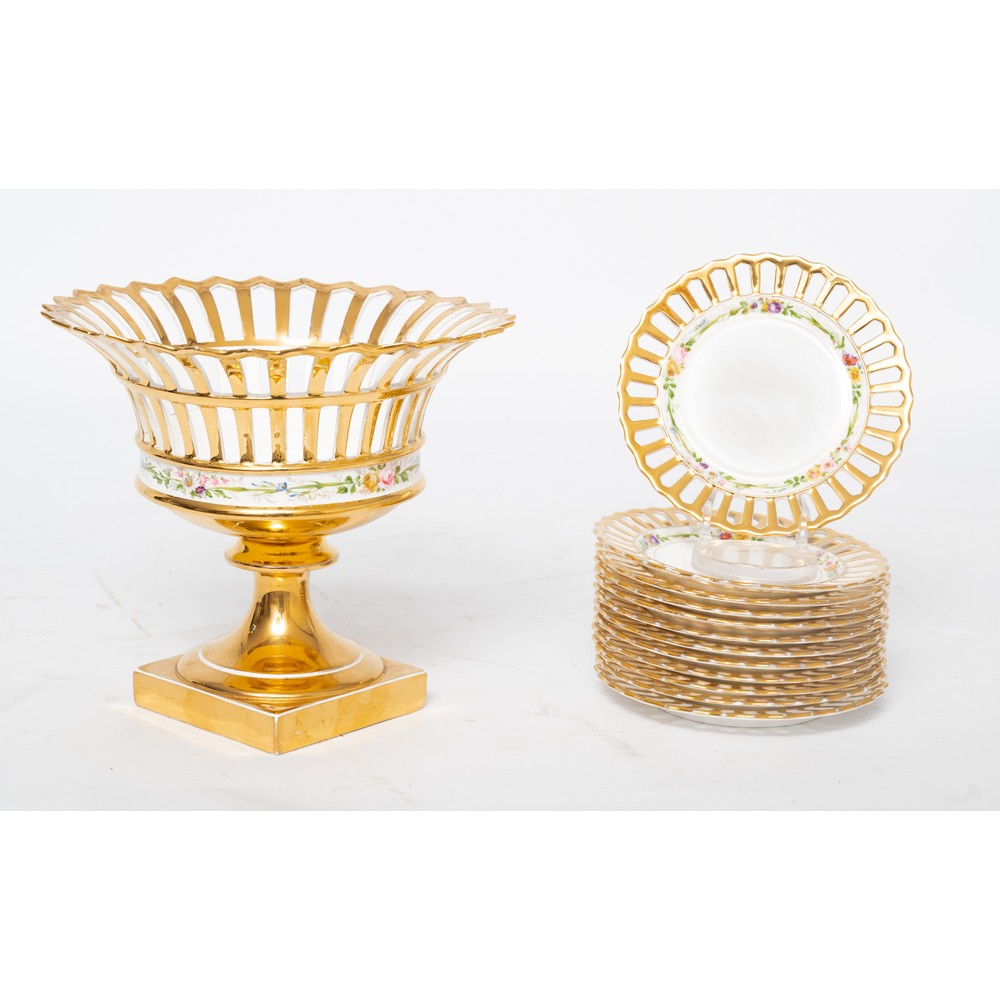 Fruttiera con dodici piattini stile Impero in porcellana con decori a motivo floreale e fogliaceo, riccamente lumeggiati in oro.