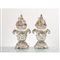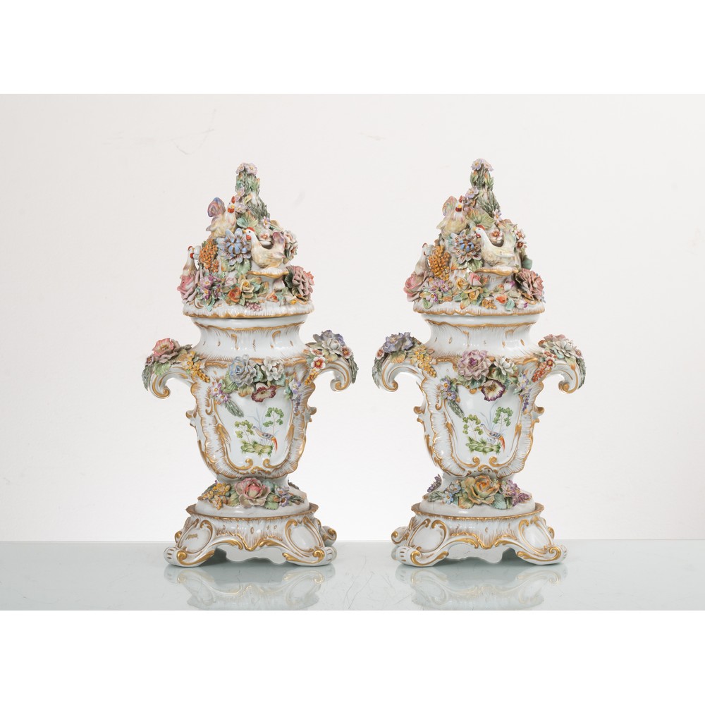 Coppia di vasi con coperchio in porcellana decorata e riccamente guarnita da fiori (usure).