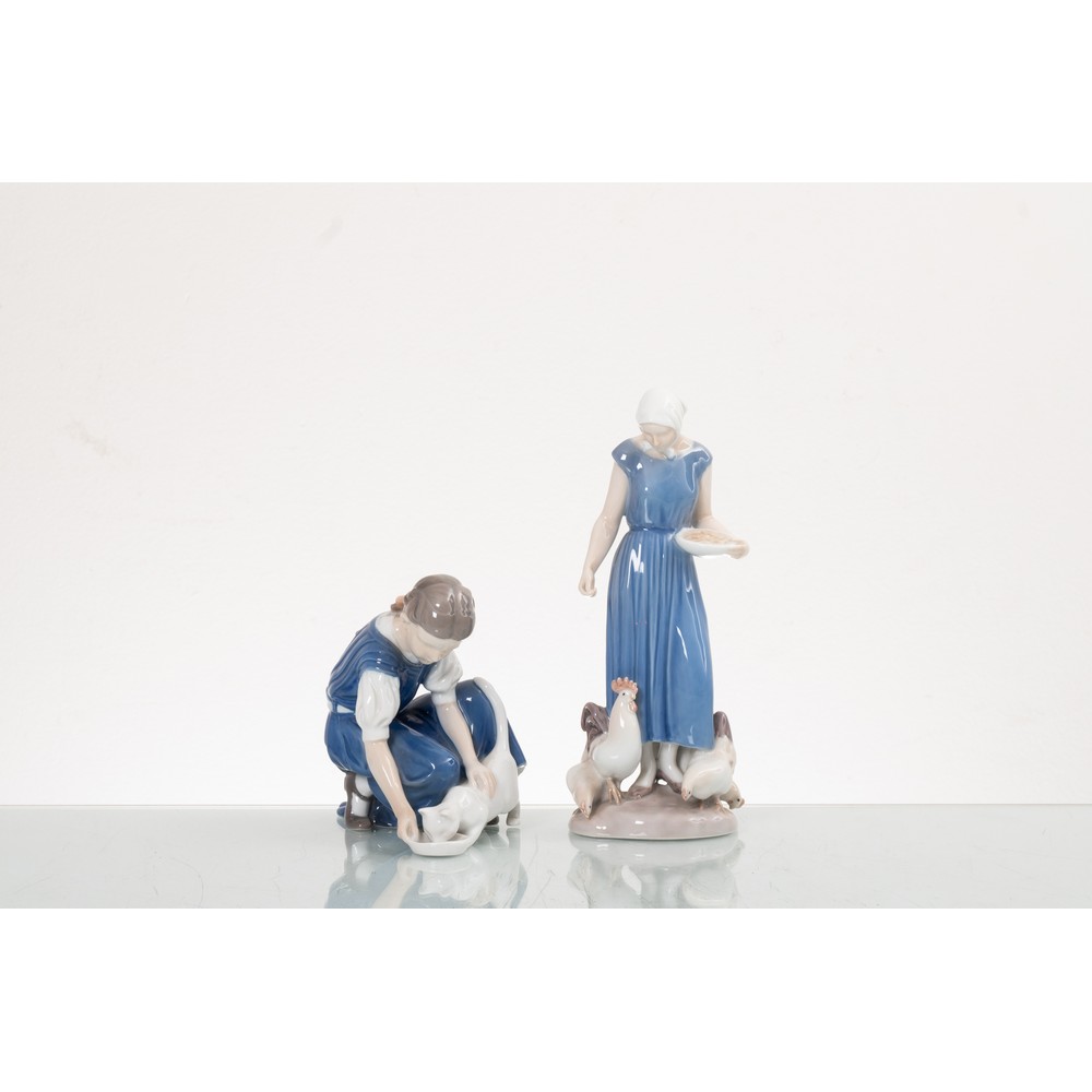 Due sculture in porcellana decorata raffiguranti "Figure con animali".