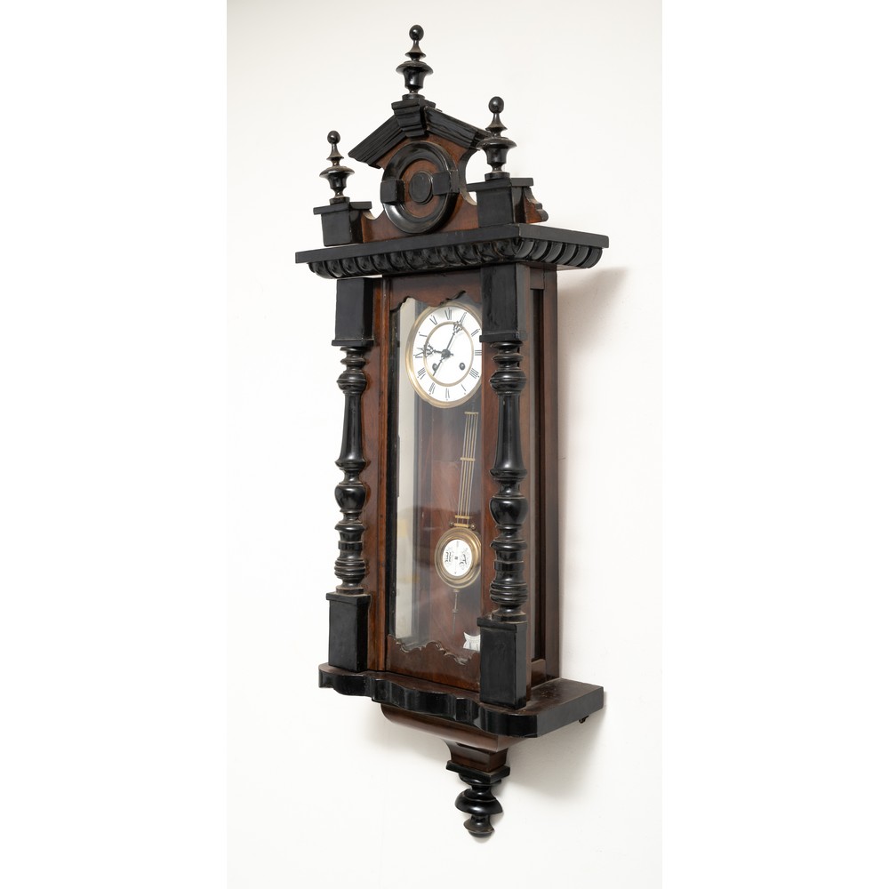 Orologio a pendolo da parete in legno di noce ebanizzato, quadrante smaltato con numeri romani.