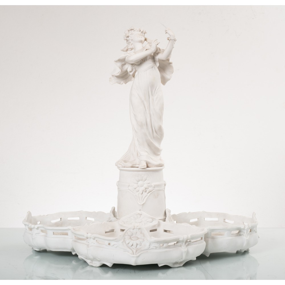 Centrotavola Liberty in biscuit bianco raffigurante "Figura femminile" con tre vaschette divise (vaschetta mancante).