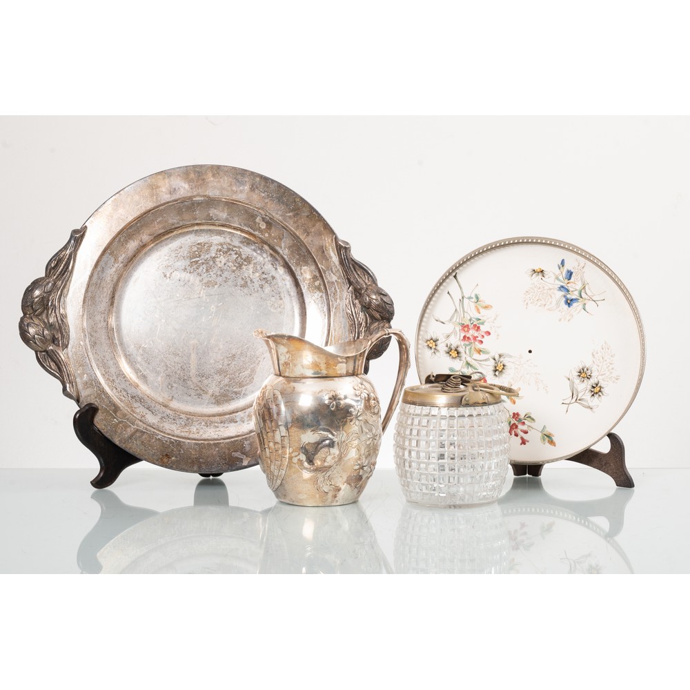 Vassoio in metallo argentato, brocca in metallo argentato con decori a motivo floreale, vassoio in metallo e ceramica decorata a motivo floreale ed una biscottiera in vetro e metallo.
