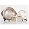 Vassoio in metallo argentato, brocca in metallo argentato con decori a motivo floreale, vassoio in metallo e ceramica decorata a motivo floreale ed una biscottiera in vetro e metallo.