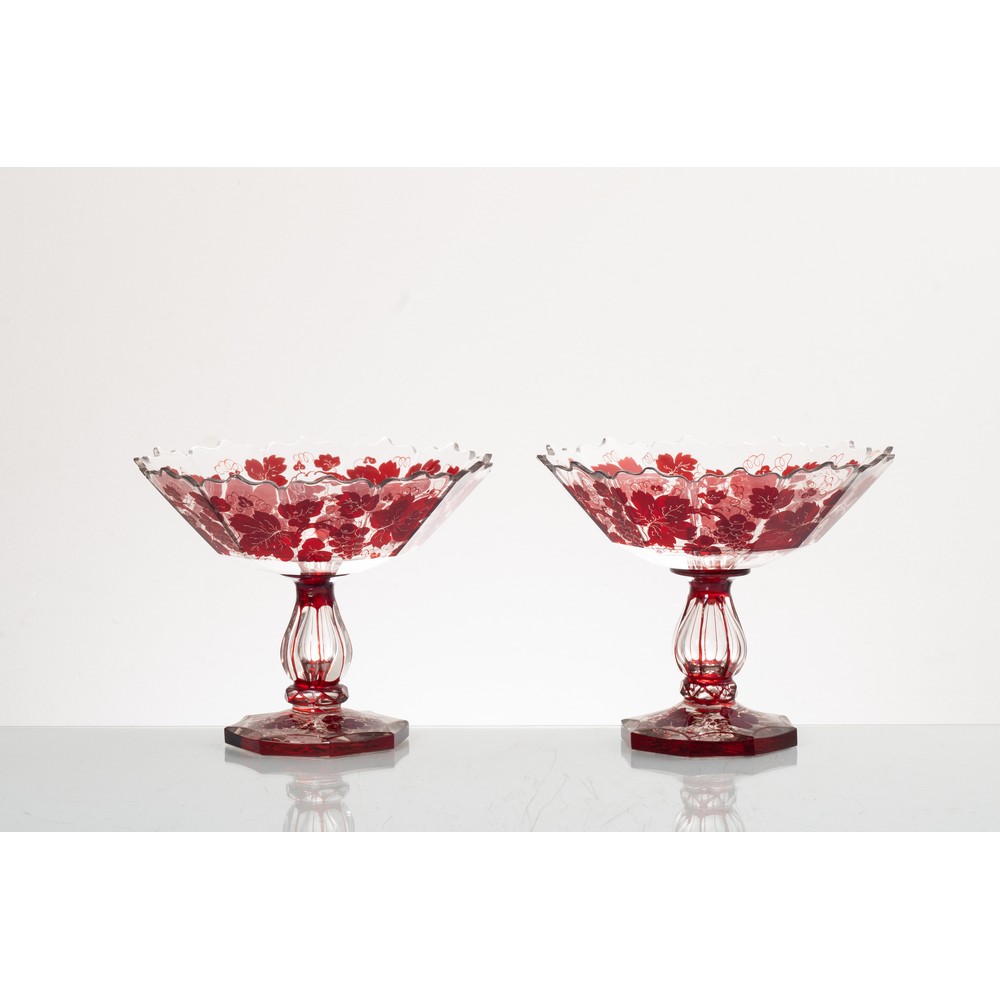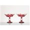 Due coppe in vetro con decori a motivo fogliaceo nei toni del bordeaux (rotture).