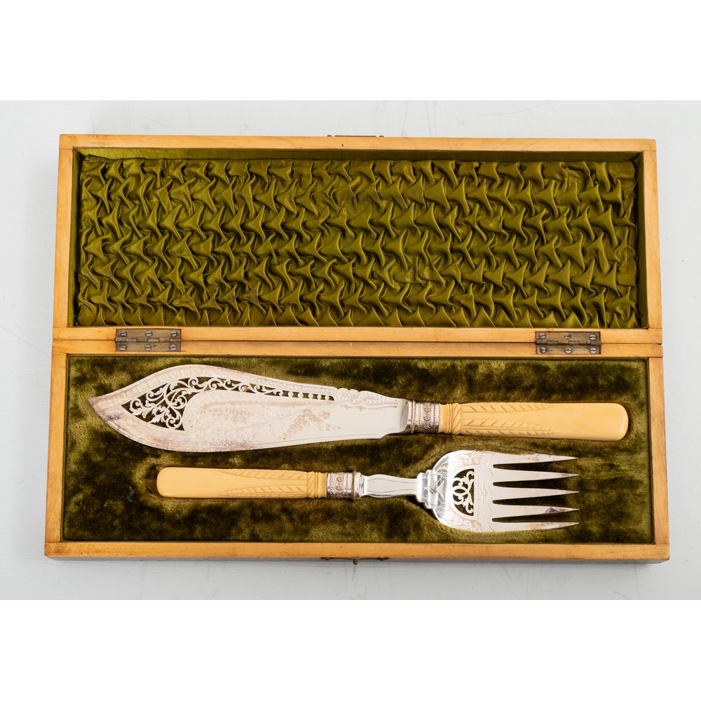 Due posate da portata per pesce con manico in osso entro custodia in legno.