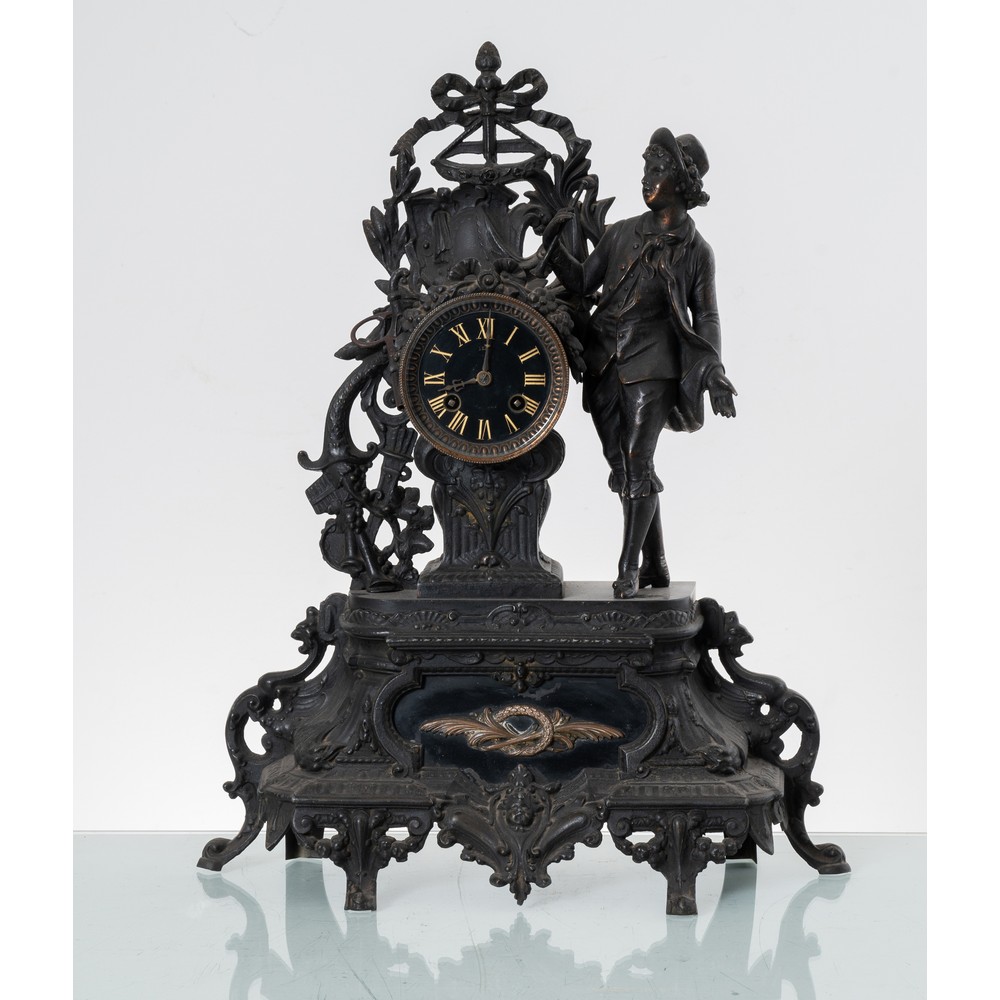 Orologio in antimonio con figura, quadrante con numeri romani (usure e mancanze).