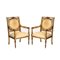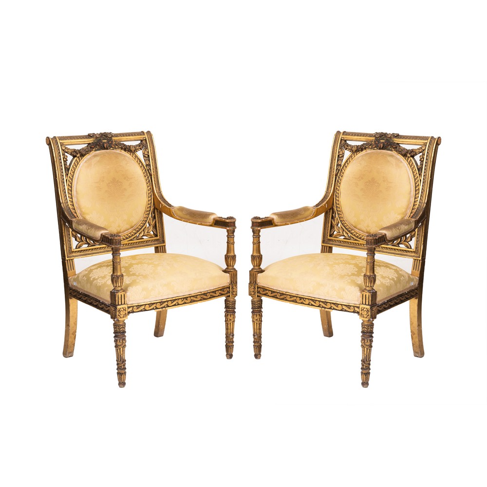 Coppia di poltrone stile Luigi XVI in legno dorato, tappezzeria damascata nei toni del giallo.