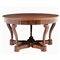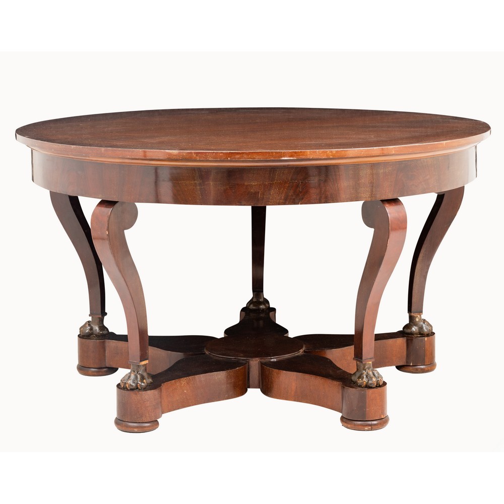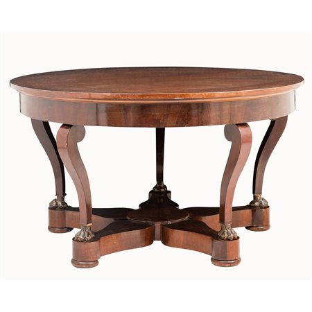 Tavolo di forma circolare in legno di mogano, piede a zampe leonine.