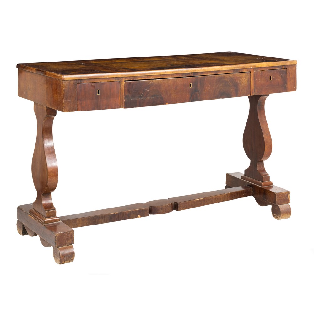 Scrittoio in legno di mogano e piuma di mogano con cassetto centrale.