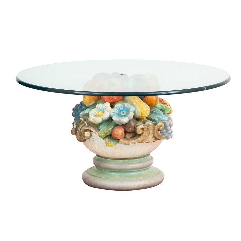 TAVOLINO da salotto in terracotta dipinta raffigurante "Frutta e fiori" con piano in vetro.