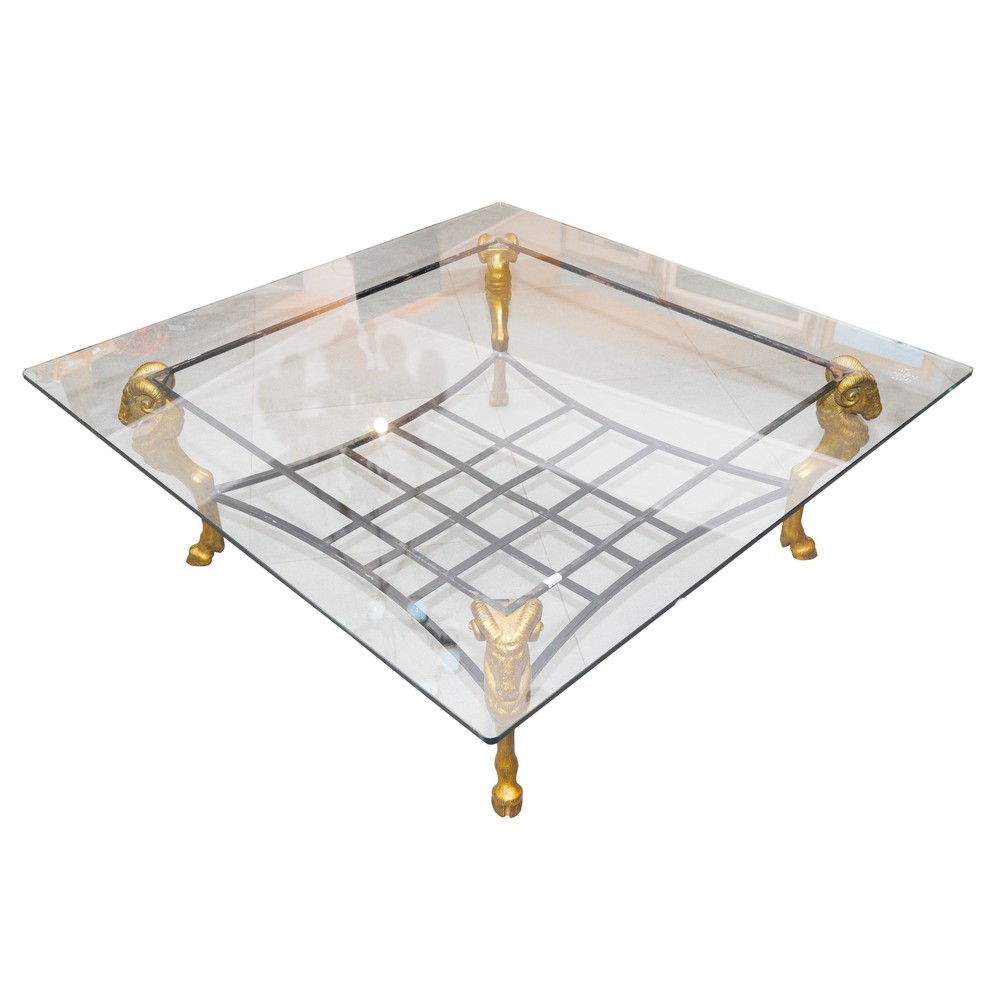 Tavolino da salotto in ferro e resina con piedi raffiguranti "Arieti", piano in vetro.