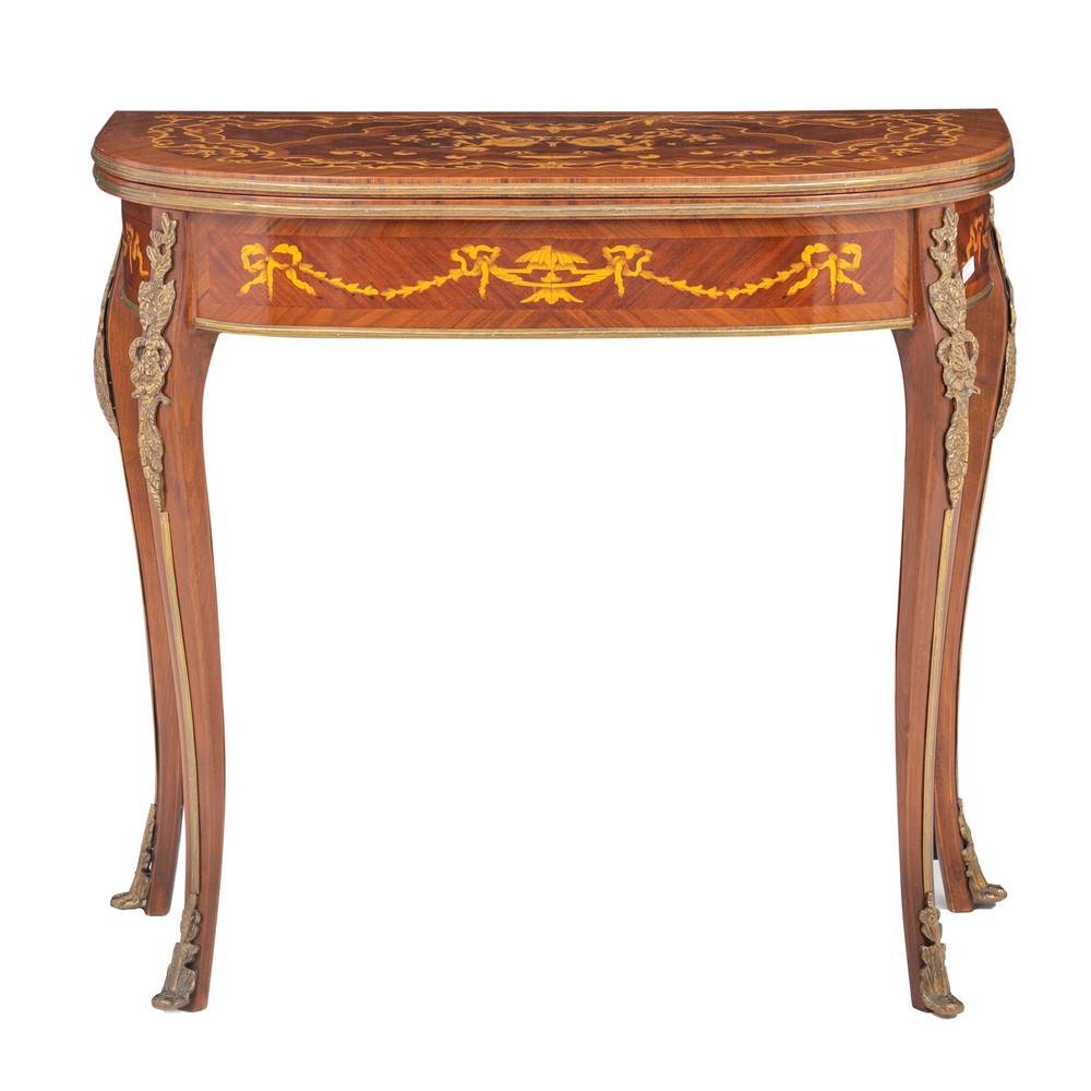 Tavolo da gioco a libro in legno di mogano e legno di rosa, riccamente intarsiato in legno di bosso.